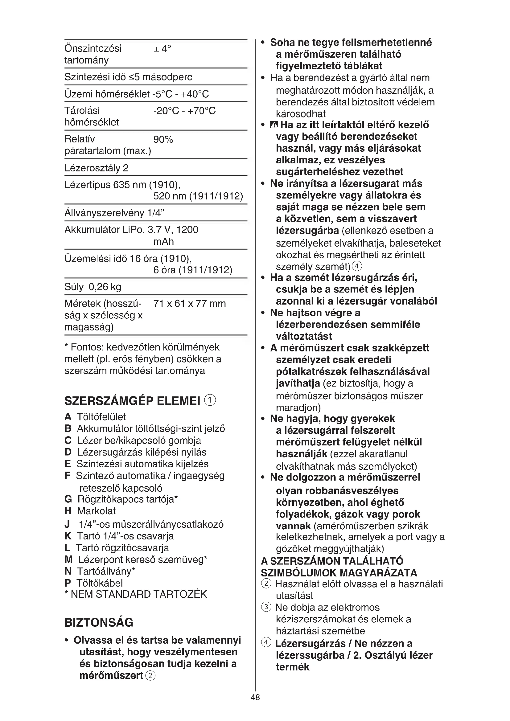 Lézersugárzás / Ne nézzen a lézerssugárba / 2. Osztályú lézer termék Önszintezési tartomány ± 4° Szintezési idő ≤5 másodperc Üzemi hőmérséklet -5°C - +40°C Tárolási hőmérséklet -20°C - +70°C Relatív páratartalom (max.) 90% Lézerosztály 2 Lézertípus 635 nm (1910), 520 nm (1911/1912) Állványszerelvény 1/4” Akkumulátor LiPo, 3.7 V, 1200 mAh Üzemelési idő 16 óra (1910), 6 óra (1911/1912) Súly 0,26 kg Méretek (hosszú- ság x szélesség x magasság) 71 x 61 x 77 mm