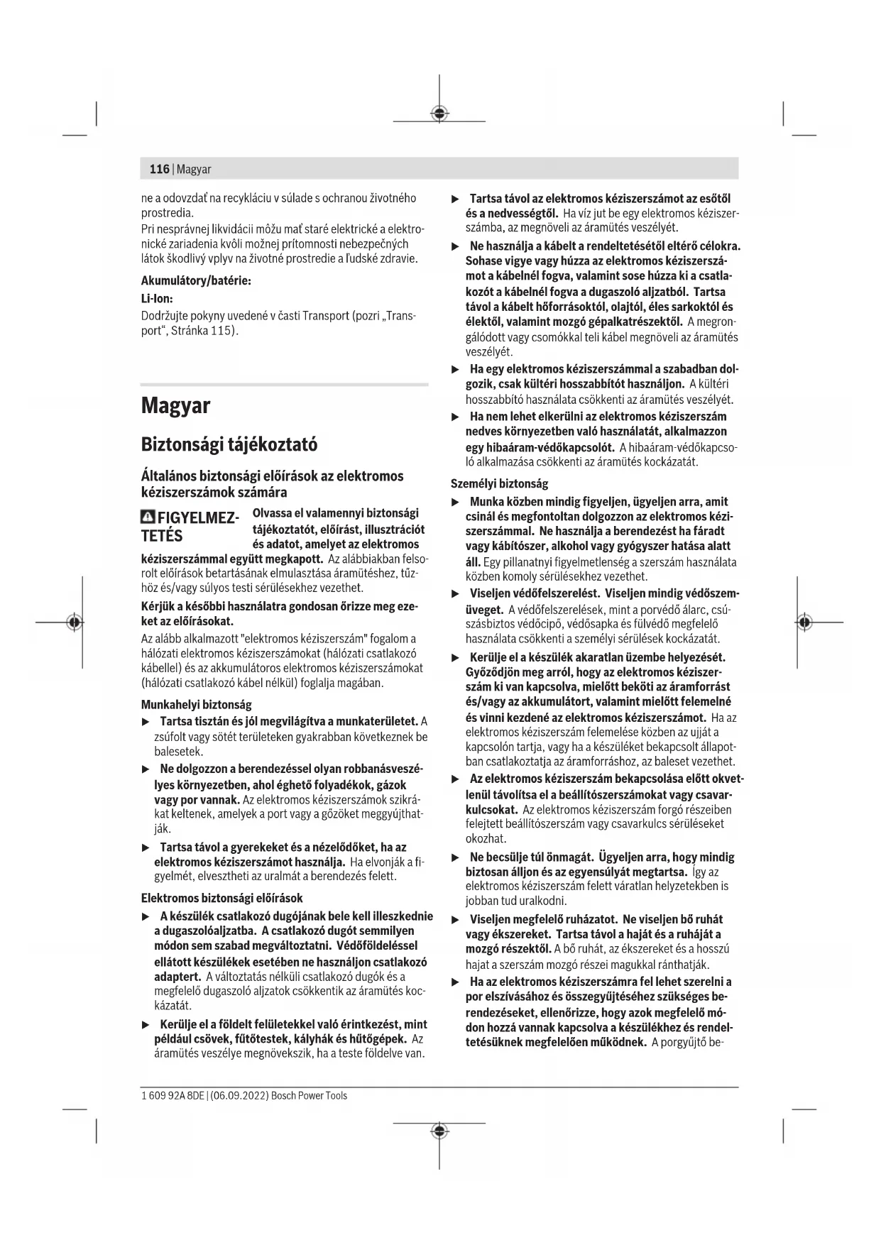 Vysoký rozsah otáčok; vhodný na práce smalým vŕtacím priemerom. u Posúvajte prepínač rýchlostných stupňov vždy až na doraz. Inak by sa mohlo ručné elektrické náradie po- škodiť. Tepelná ochrana proti preťaženiu Pri používaní vsúlade surčením sa elektrické náradie nemô- že preťažiť. Pri nadmernom zaťažení alebo prekročení prípustného rozsahu prevádzkovej teploty sa znížia otáčky. Elektrické náradie pracuje znova na plné otáčky až po dosia- hnutí prípustnej prevádzkovej teploty. Plnoautomatická aretácia vretena (Auto-Lock) Pri nestlačenom vypínači (11) sa vŕtacie vreteno, atým aj upínanie nástroja (1) zaaretuje. To umožňuje zaskrutkovávanie skrutiek aj vtedy, keď je aku- mulátor (7) vybitý, alebo používanie tohto elektrického nára- dia ako klasického skrutkovača. Upozornenia týkajúce sa prác u Na skrutku prikladajte elektrické náradie iba vo vy- pnutom stave. Otáčajúce sa pracovné nástroje by sa mohli zošmyknúť. Pred skrutkovaním väčších adlhších skrutiek do tvrdých materiálov by ste mali vrtákom spriemerom rovným jadru závitu skrutky predvŕtať otvor do 2/3 dĺžky skrutky. Na odstránenie skrutkovacieho hrotu alebo univerzálneho držiaka hrotov sa smie použiť pomocný nástroj. Spona na opasok Pomocou upínacej spony (6) si môžete zavesiť toto ručné elektrické náradie napr. na opasok. Vtakom prípade budete mať obe ruky voľné aručné elektrické náradie budete mať stále vpohotovosti. Údržba aservis Údržba ačistenie u Pred všetkými prácami na elektrickom náradí (naprí- klad údržba, výmena nástroja apodobne), ako aj pri jeho preprave auskladnení vyberte akumulátor zelektrického náradia. Vprípade neúmyselného aktivo- vania vypínača hrozí nebezpečenstvo poranenia. u Elektrické náradie ajeho vetracie štrbiny udržiavajte vždy včistote, aby ste mohli pracovať dobre abezpeč- ne. Zákaznícka služba aporadenstvo ohľadom použitia Servisné stredisko Vám odpovie na otázky týkajúce sa opravy aúdržby Vášho produktu ako aj náhradných dielov. Rozkladové výkresy ainformácie onáhradných dieloch náj- dete tiež na: www.bosch-pt.com Vprípade otázok týkajúcich sa našich výrobkov apríslušen- stva Vám ochotne pomôže poradenský tím Bosch. Vprípade akýchkoľvek otázok aobjednávok náhradných dielov uvádzajte bezpodmienečne 10‑miestne vecné číslo uvedené na typovom štítku výrobku. Slovakia Na www.bosch-pt.sk si môžete objednať opravu vášho stroja alebo náhradné diely online. Tel.: +421 2 48 703 800 Fax: +421 2 48 703 801 E-Mail: servis.naradia@sk.bosch.com www.bosch-pt.sk Ďalšie adresy servisov nájdete na: www.bosch-pt.com/serviceaddresses Transport Odporúčané lítiovo-iónové akumulátory podliehajú požiadavkám na transport nebezpečného nákladu. Tieto aku- mulátory smie používateľ náradia prepravovať po cestách bez ďalších opatrení. Pri zasielaní tretími osobami (napr.: leteckou dopravou alebo prostredníctvom špedície) treba rešpektovať osobitné požiadavky na obaly aoznačenie. Vtakomto prípade treba pri príprave zásielky bezpodmienečne konzultovať sodborní- kom na prepravu nebezpečného tovaru. Akumulátory zasielajte iba vtedy, ak nemajú poškodený obal. Otvorené kontakty prelepte aakumulátor zabaľte tak, aby sa vobale nemohol posúvať. Rešpektujte aj prípadné doplňujú- ce národné predpisy. Likvidácia Ručné elektrické náradie, príslušenstvo aobal treba dať na recykláciu zodpovedajúcu ochrane životného prostredia. Neodhadzujte ručné elektrické náradie ani aku- mulátory/batérie do komunálneho odpadu! Len pre krajinyEÚ: Podľa európskej smernice 2012/19/EÚ oodpade zelektrických aelektronických zariadení apodľa jej trans- pozície vnárodnom práve sa musí už nepoužiteľné elektrické náradie a, podľa európskej smernice 2006/66/ES, po- škodené alebo vybité akumulátory/batérie zbierať separova- Bosch Power Tools 1 609 92A 8DE | (06.09.2022)116 | Magyar ne aodovzdať na recykláciu vsúlade sochranou životného prostredia. Pri nesprávnej likvidácii môžu mať staré elektrické aelektro- nické zariadenia kvôli možnej prítomnosti nebezpečných látok škodlivý vplyv na životné prostredie aľudské zdravie. Akumulátory/batérie: Li-Ion: Dodržujte pokyny uvedené včasti Transport (pozri „Trans- port“, Stránka115). Magyar Biztonsági tájékoztató Általános biztonsági előírások az elektromos kéziszerszámok számára FIGYELMEZ- TETÉS Olvassa el valamennyi biztonsági tájékoztatót, előírást, illusztrációt és adatot, amelyet az elektromos kéziszerszámmal együtt megkapott. Az alábbiakban felso- rolt előírások betartásának elmulasztása áramütéshez, tűz- höz és/vagy súlyos testi sérülésekhez vezethet. Kérjük a későbbi használatra gondosan őrizze meg eze- ket az előírásokat. Az alább alkalmazott "elektromos kéziszerszám" fogalom a hálózati elektromos kéziszerszámokat (hálózati csatlakozó kábellel) és az akkumulátoros elektromos kéziszerszámokat (hálózati csatlakozó kábel nélkül) foglalja magában. Munkahelyi biztonság u Tartsa tisztán és jól megvilágítva a munkaterületet. A zsúfolt vagy sötét területeken gyakrabban következnek be balesetek. u Ne dolgozzon a berendezéssel olyan robbanásveszé- lyes környezetben, ahol éghető folyadékok, gázok vagy por vannak. Az elektromos kéziszerszámok szikrá- kat keltenek, amelyek a port vagy a gőzöket meggyújthat- ják. u Tartsa távol a gyerekeket és a nézelődőket, ha az elektromos kéziszerszámot használja. Haelvonják a fi- gyelmét, elvesztheti az uralmát a berendezés felett. Elektromos biztonsági előírások u A készülék csatlakozó dugójának bele kell illeszkednie a dugaszolóaljzatba. A csatlakozó dugót semmilyen módon sem szabad megváltoztatni. Védőfö