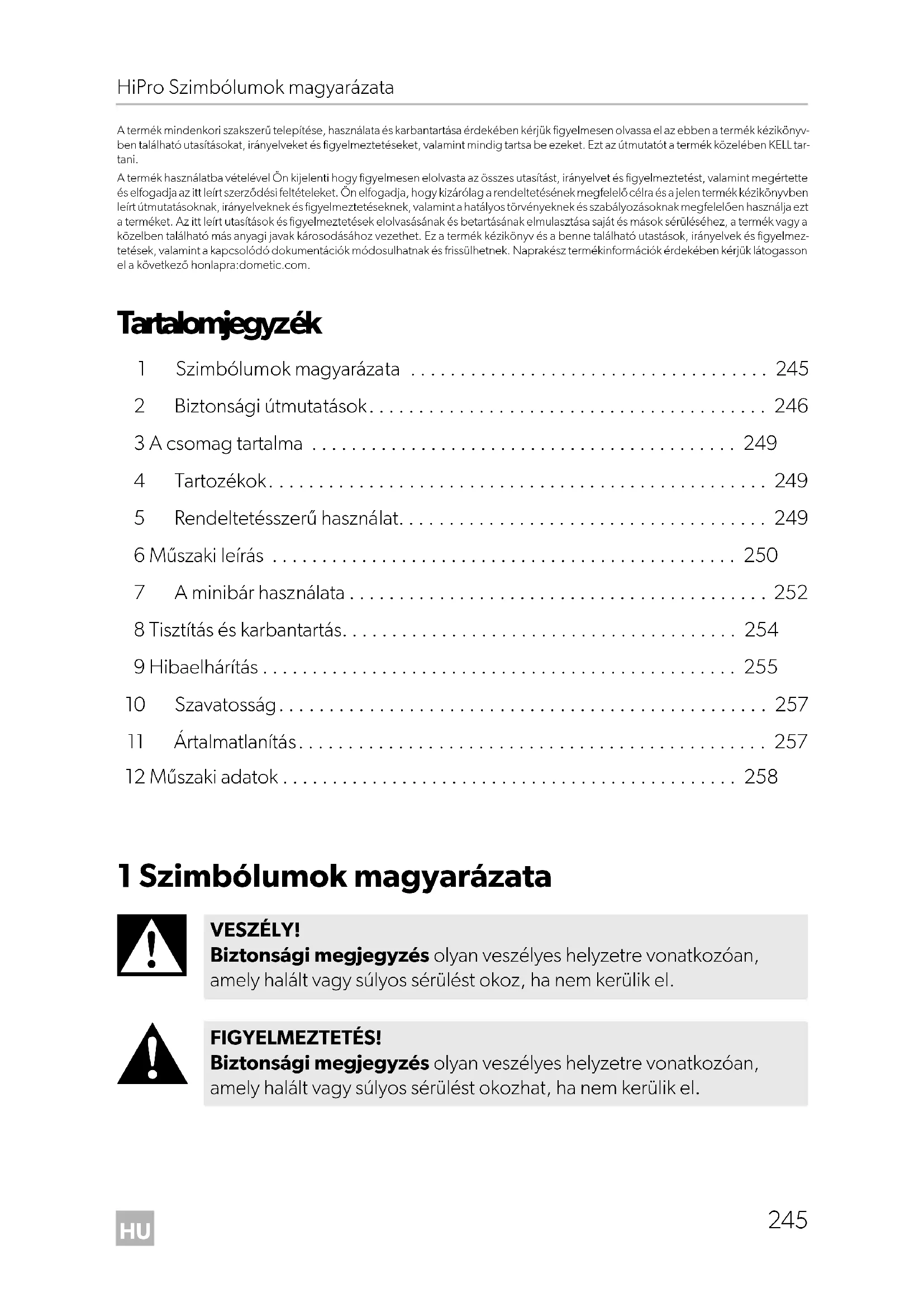 - A hűtőkörben található hűtőközeg gyúlékony. A hűtőkör sérülése esetén: – Kapcsolja ki a minibárt. – Kerülje a nyílt lángot és a gyújtószikrákat. – Szellőztesse ki jól a helyiséget. VIGYÁZAT! Biztonsági megjegyzés olyan veszélyes helyzetre vonatkozóan, amely könnyű vagy közepesen súlyos sérülést okozhat, ha nem kerülik el. FIGYELEM! Felhívás olyan helyzetre, amely dologi kárt okozhat, ha nem kerülik el. MEGJEGYZÉS A termék kezelésére vonatkozó kiegészítő információk. DometicHiPro30-40_OPM_4445103227_EMEA25_xxxx-xx-xx.book Seite 246 Freitag, 16. April 2021 2:47 14HU HiPro Biztonsági útmutatások