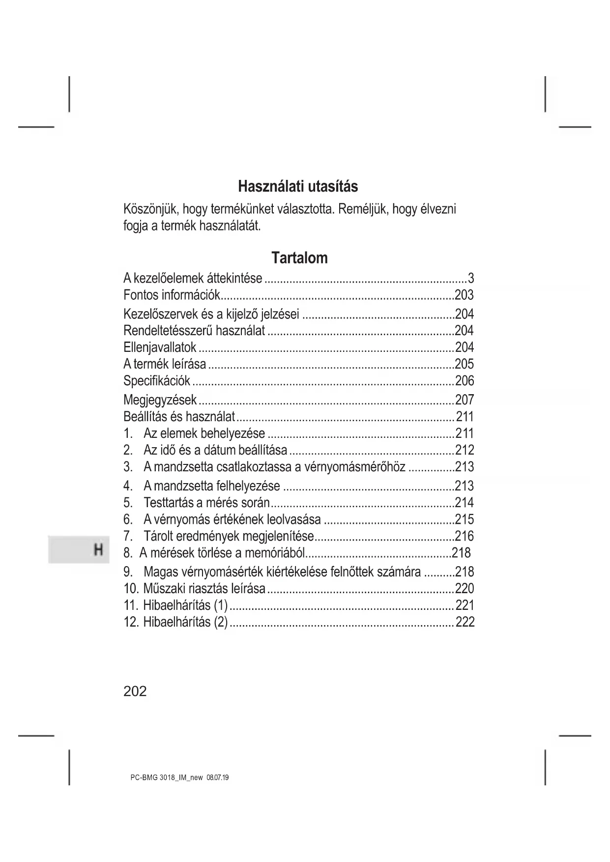 Diasztolés nyomásérték / pulzusszám megjelenítése (felváltva) 11 Fújásra kész jelzés 12 Szabálytalan szívverés szimbólum 13 Vérnyomásérték besorolása jelzés 14 Alacsony töltöttségi szint jelzés Rendeltetésszerű használat A teljesen automatikus elektronikus vérnyomásmérő egészségügyi szakemberek általi vagy otthoni használatra készült. Ez a non-in- vazív vérnyomásmérő rendszer felnőttek diasztolés és szisztolés vérnyomásának, valamint pulzusszámának mérésére alkalmas egy non-invazív technikával, amelyben egy felfújható mandzsetta van a csukló köré tekerve. Ellenjavallatok Ezen elektronikus vérnyomásmérő nem használható súlyos ritmuszavarban szenvedő embereknél.205 PC-BMG 3018_IM_new 08.07.19 A termék leírása Az oszcillometriás módszer és az integrált szilikon nyomásérzékelő segítségével a vérnyomás és a pulzusszám automatikusan, non-in- vazív módon mérhető. Az LCD kijelző mutatja a vérnyomás és a pulzusszám értékét. Az utolsó 2 × 60 mérés dátum és időbélyegzővel eltárolható a memóriában. A készülék szintén meg tudja jeleníteni az utolsó három mérés átlagát. Az elektronikus vérnyomásmérő az alábbi szabványoknak felel meg: IEC 60601-1 Edition 3.1 2012-08 / EN 60601-1: 2006 / A1: 2013 (Orvosi elektromos berendezés - 1. rész: A biztonságos használatára és teljesítményre vonatkozó általános követelmények), IEC 60601-1-2: 2014 / EN 60601-1-2: 2015 (Orvosi elektromos berendezés - 1-2. rész: A biztonságos használatára és teljesítményre vonatkozó általános követelmények - Kiegészítő szabvány: Elektromágneses kompatibilitás - Követelmények és vizsgálatok), IEC 80601-2-30: 2009 + AMD1: 2013 / EN 80601-2-30: 2010 / A1: 2015 (Orvosi elektromos berendezés - 2-30. rész: Az automata non-invazív vérnyomásmérők biztonságos használatára és teljesítményére vonatkozó követelmények), EN 1060-1: 1995 + A2: 2009 (Non-invazív vérnyomásmérők - 1. rész: Általános követelmények), EN 1060-3: 1997 + A2: 2009 (Non-invazív vérnyomásmérők - 3. rész: Az elektro-mechanikus vérnyomásmérő rendszerekre vonatkozó kiegészítő követelmények), ISO 81060-2: 2013 (nem invazív vérnyomásmérők - 2. rész: Automatikus méréstípus klinikai jóváhagyása).206 PC-BMG 3018_IM_new 08.07.19 Specikációk