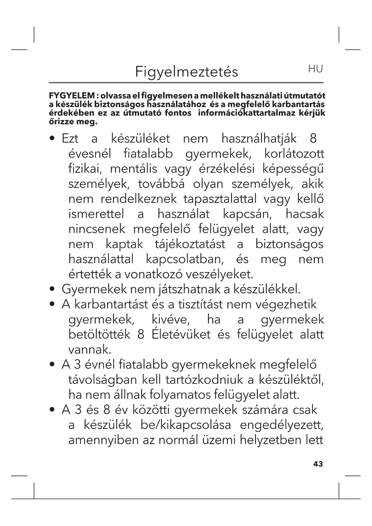 - A 3 és 8 év közötti gyermekek számára csak a készülék be/kikapcsolása engedélyezett, amennyiben az normál üzemi helyzetben lett FYGYELEM : olvassa el figyelmesen a mellékelt használati útmutatót a készülék biztonságos használatához és a megfelelő karbantartás érdekében ez az útmutató fontos információkattartalmaz kérjük őrizze meg. Figyelmeztetés HU44