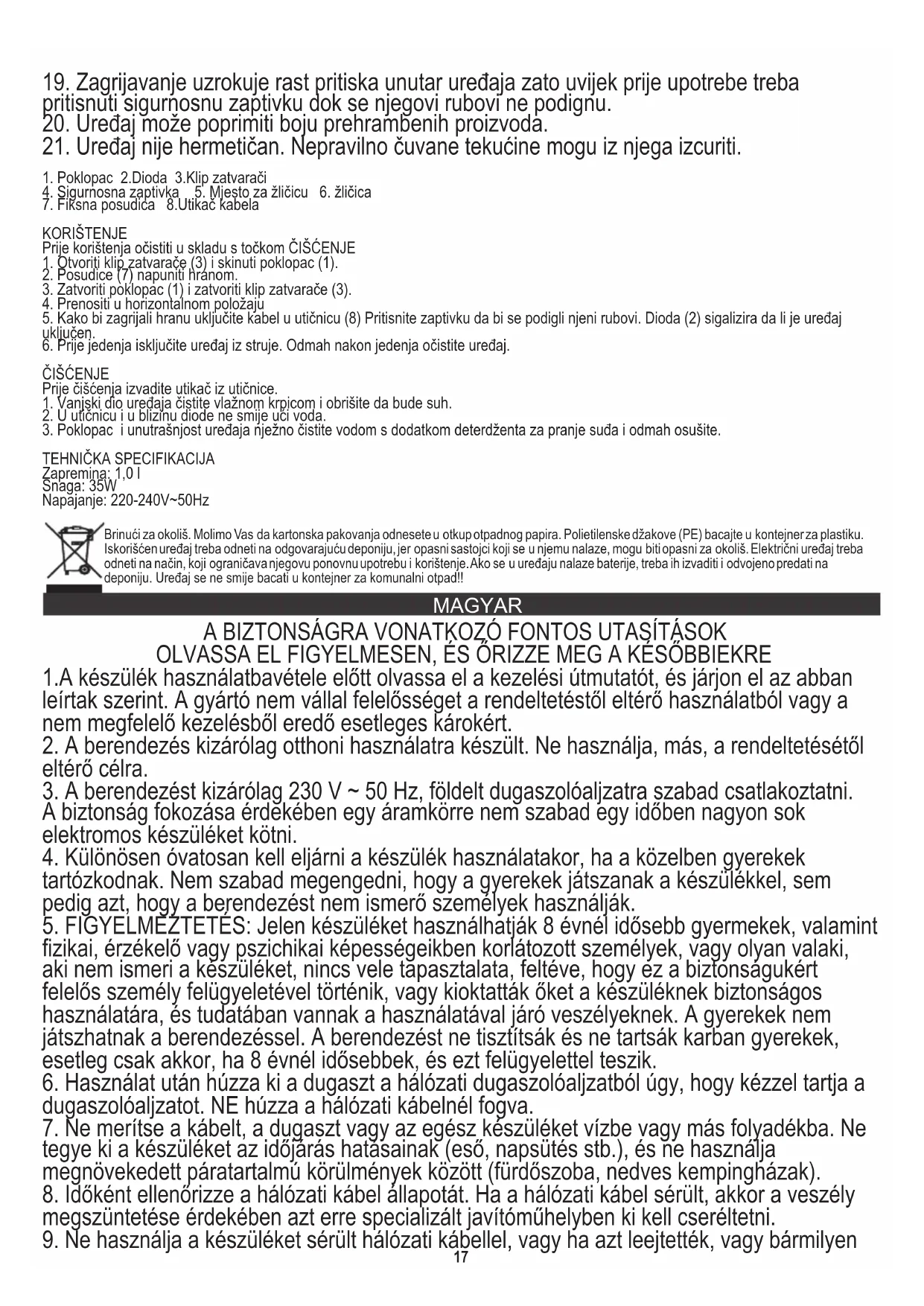 Zapremina: 1,0 l Snaga: 35W Napajanje: 220-240V~50Hz Brinući za okoliš. Molimo Vas da kartonska pakovanja odnesete u otkup otpadnog papira. Polietilenske džakove (PE) bacajte u kontejner za plastiku. Iskorišćen uređaj treba odneti na odgovarajuću deponiju, jer opasni sastojci koji se u njemu nalaze, mogu biti opasni za okoliš. Električni uređaj treba odneti na način, koji ograničava njegovu ponovnu upotrebu i korištenje. Ako se u uređaju nalaze baterije, treba ih izvaditi i odvojeno predati na deponiju. Uređaj se ne smije bacati u kontejner za komunalni otpad!! MAGYAR A BIZTONSÁGRA VONATKOZÓ FONTOS UTASÍTÁSOK OLVASSA EL FIGYELMESEN, ÉS ŐRIZZE MEG A KÉSŐBBIEKRE 1.A készülék használatbavétele előtt olvassa el a kezelési útmutatót, és járjon el az abban leírtak szerint. A gyártó nem vállal felelősséget a rendeltetéstől eltérő használatból vagy a nem megfelelő kezelésből eredő esetleges károkért.