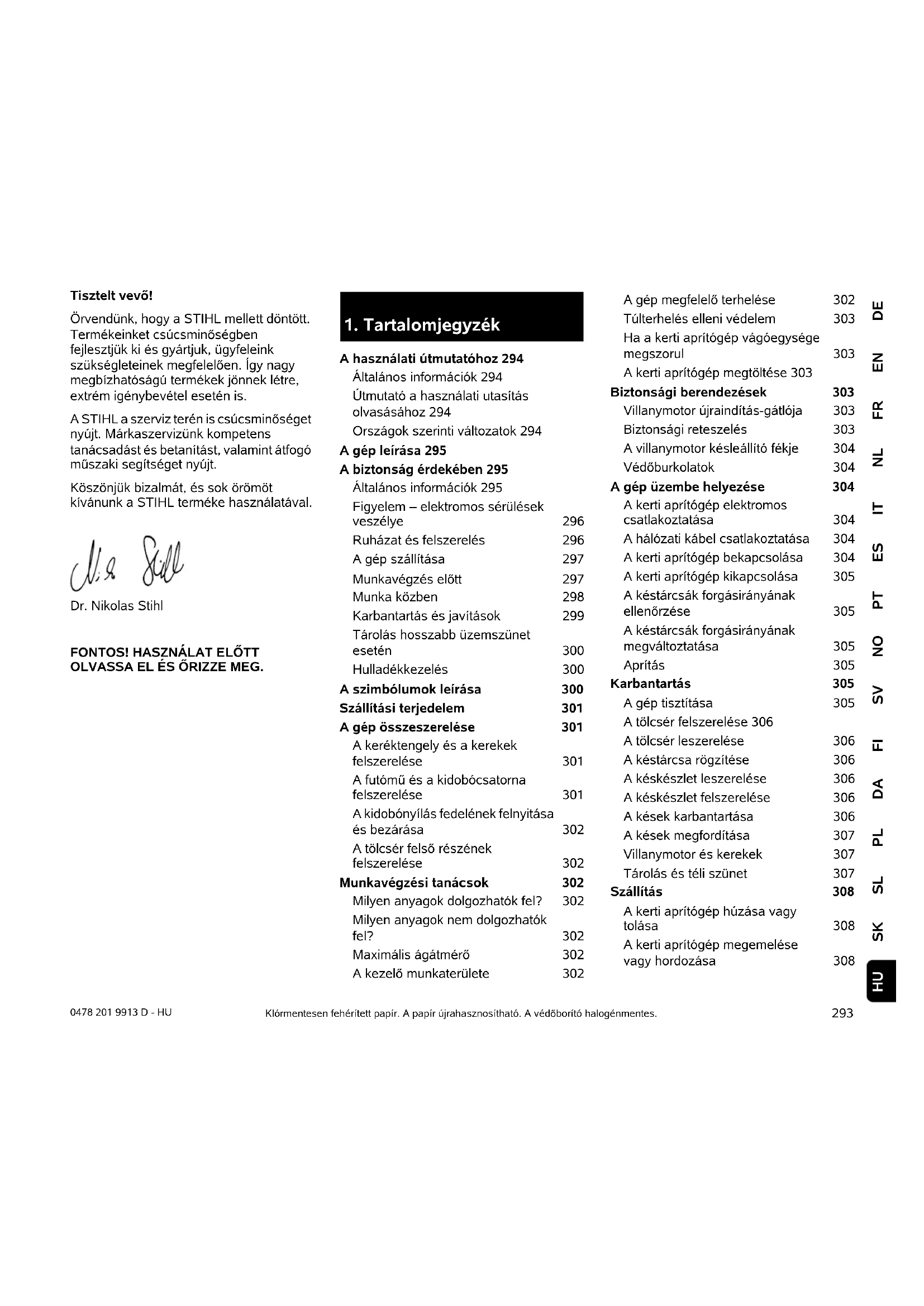 DEENFRNLITESPTNOSVFIDAPLSLSKHU 0478 201 9913 D - HU Tisztelt vevő! Örvendünk, hogy a STIHL mellett döntött. Termékeinket csúcsminőségben fejlesztjük ki és gyártjuk, ügyfeleink szükségleteinek megfelelően. Így nagy megbízhatóságú termékek jönnek létre, extrém igénybevétel esetén is. A STIHL a szerviz terén is csúcsminőséget nyújt. Márkaszervizünk kompetens tanácsadást és betanítást, valamint átfogó műszaki segítséget nyújt. Köszönjük bizalmát, és sok örömöt kívánunk a STIHL terméke használatával. Dr. Nikolas Stihl