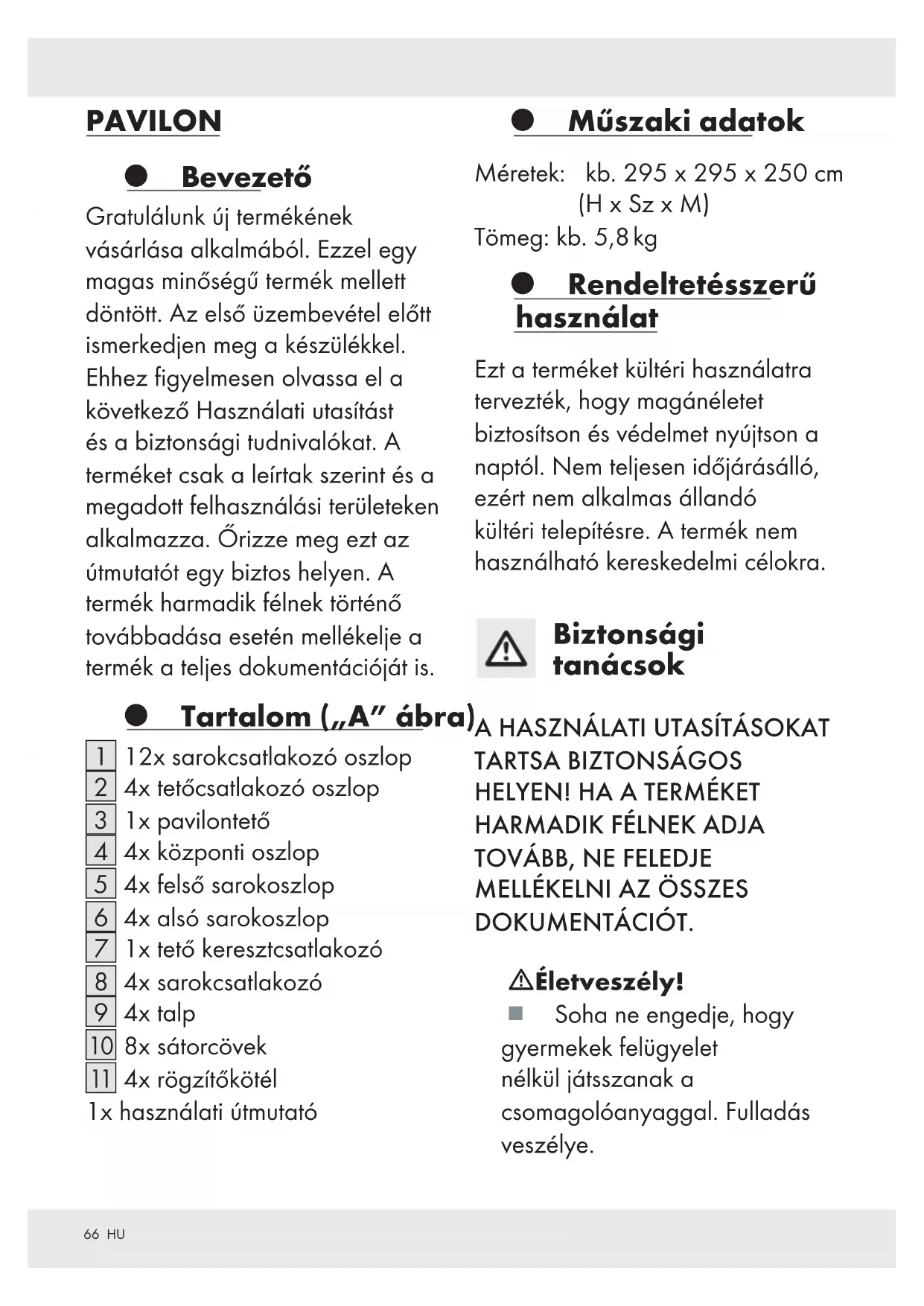 DOKUMENTÁCIÓT. mÉletveszély! Soha ne engedje, hogy gyermekek felügyelet nélkül játsszanak a csomagolóanyaggal. Fulladás veszélye.67 HU mSérülésveszély! A terméket nem szabad kedvezőtlen időjárási körülmények között, például erős szélben, vagy heves esőben és hóesésben használni. Szerelje le a pavilont, ha a szélsebesség várhatóan meghaladja a 40 km/h-t (élénk és jól hallható szél, nagyobb ágak és fák mozgása). Szerelje le a terméket, ha a szél erősödni kezd, vagy ha egyéb kedvezőtlen időjárási körülmények lépnek fel. Különösen ügyeljen arra, hogy a termék felállítása és leszerelése közben ne nyomja össze az ujjait. Ez zúzódások formájában sérülést okozhat. Helyezze a terméket sík felületre. Jelezze más személyeknek a rögzítőkötél jelenlétét, és figyelmeztesse őket a botlásveszélyre. Használat előtt győződjön meg arról, hogy a termék teljesen ki van feszítve. A termék csak felnőttek felügyelete mellett használható, és nem játékszernek készült. Minden használat előtt ellenőrizze a terméket sérülés vagy kopás szempontjából. A termék használata előtt ellenőrizze, hogy minden elem megfelelően lett-e felszerelve. A helytelen összeszerelés csökkentheti a biztonságot és a funkcionalitást. Ne használjon nyílt tüzet, grillsütőt vagy teraszfűtést a termékben vagy annak közelében. Tűz esetén azonnal hagyja el a pavilont! Használjon tűzoltókészüléket vagy vizet a tűz eloltásához. Szükség esetén haladéktalanul riassza a tűzoltóságot. Az egyes pavilonokat nem szabad összekötni vagy egymáshoz rögzíteni. Az egyes pavilonok között legalább 3 méteres távolságot kell tartani. A felgyülemlett vizet el kell távolítani! A rögzítőköteleket teljes hosszukban kell használni.68 HU Elhelyezés A termék méretei 3 x 3 m, és további helyre van szükség a rögzítőkötelek elhelyezéséhez. Ahol csak lehetséges, a terméket olyan helyen helyezze el, ahol a széltől védve van. A talajnak vízszintesnek kell lennie, és megfelelő stabilitást kell biztosítania a sátorcövekek számára. Összeszerelés Megjegyzés! A termék felállításához legalább 2 személyre van szükség. Javasoljuk, hogy az összeszerelést 4 személy végezze.