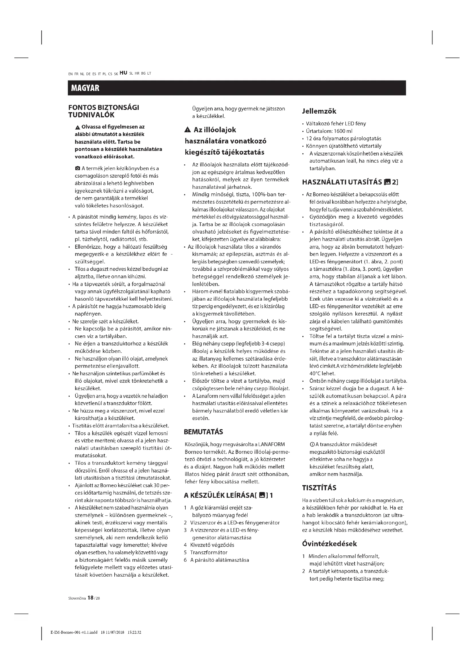 A Lanaform nem vállal felelősséget a jelen használati utasítás előírásaival ellentétes bármely használatból eredő véletlen kár esetén. BEMUTATÁS Köszönjük, hogy megvásárolta a LANAFORM Borneo termékét. Az Borneo illóolaj-perme- tező ötvözi a technológiát, a jó közérzetet és a dizájnt. Nagyon halk működés mellett illatos hideg párát áraszt szét otthonában, fehér fény kibocsátása mellett. A KÉSZÜLÉK LEÍRÁSA[