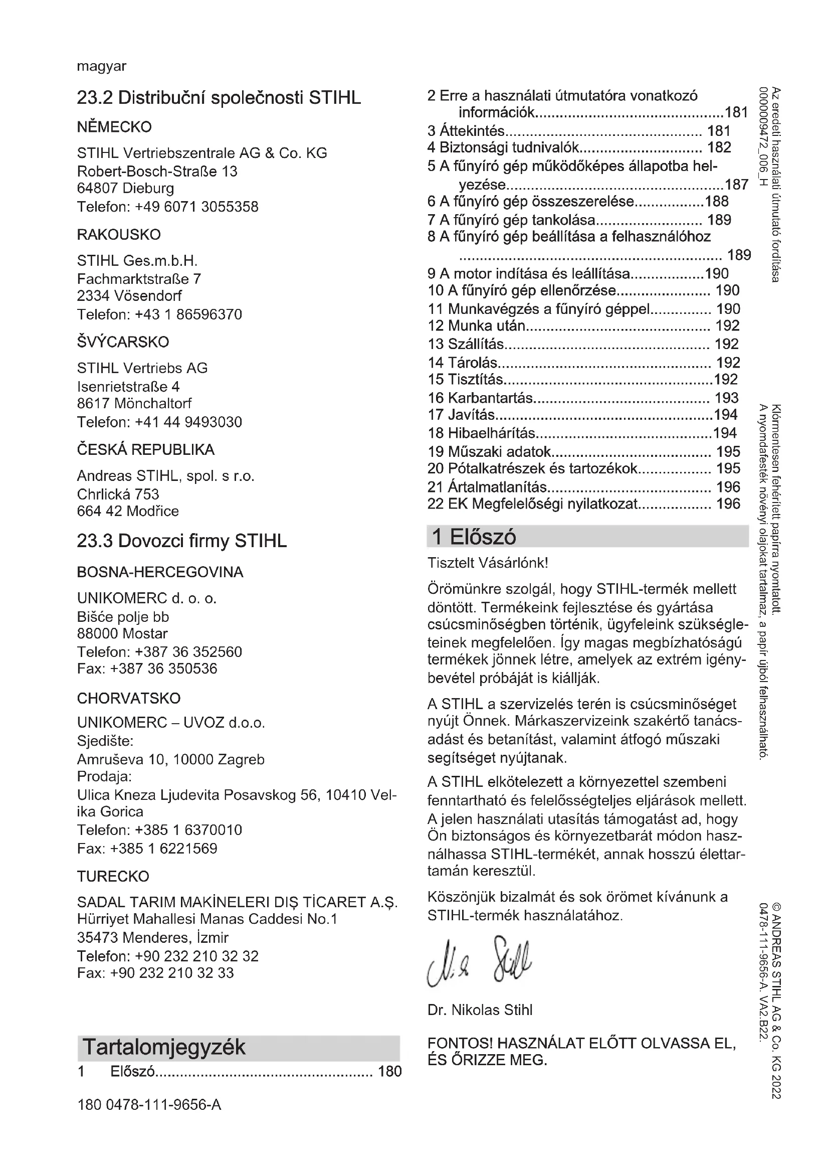 - 22 EK Megfelelőségi nyilatkozat 1 Előszó Tisztelt Vásárlónk! Örömünkre szolgál, hogy STIHL-termék mellett döntött. Termékeink fejlesztése és gyártása csúcsminőségben történik, ügyfeleink szükségle‐ teinek megfelelően. Így magas megbízhatóságú termékek jönnek létre, amelyek az extrém igény‐ bevétel próbáját is kiállják. A STIHL a szervizelés terén is csúcsminőséget nyújt Önnek. Márkaszervizeink szakértő tanács‐ adást és betanítást, valamint átfogó műszaki segítséget nyújtanak. A STIHL elkötelezett a környezettel szembeni fenntartható és felelősségteljes eljárások mellett. A jelen használati utasítás támogatást ad, hogy Ön biztonságos és környezetbarát módon hasz‐ nálhassa STIHL-termékét, annak hosszú élettar‐ tamán keresztül. Köszönjük bizalmát és sok örömet kívánunk a STIHL-termék használatához. Dr. Nikolas Stihl FONTOS! HASZNÁLAT ELŐTT OLVASSA EL, ÉS ŐRIZZE MEG. magyar 180 0478-111-9656-A © ANDREAS STIHL AG & Co. KG 2022 0478-111-9656-A. VA2.B22. Klórmentesen fehérített papírra nyomtatott. A nyomdafesték növényi olajokat tartalmaz, a papír újból felhasználható. Az eredeti használati útmutató fordítása 0000009472_006_H2 Erre a használati útmuta‐ tóra vonatkozó információk p. 196