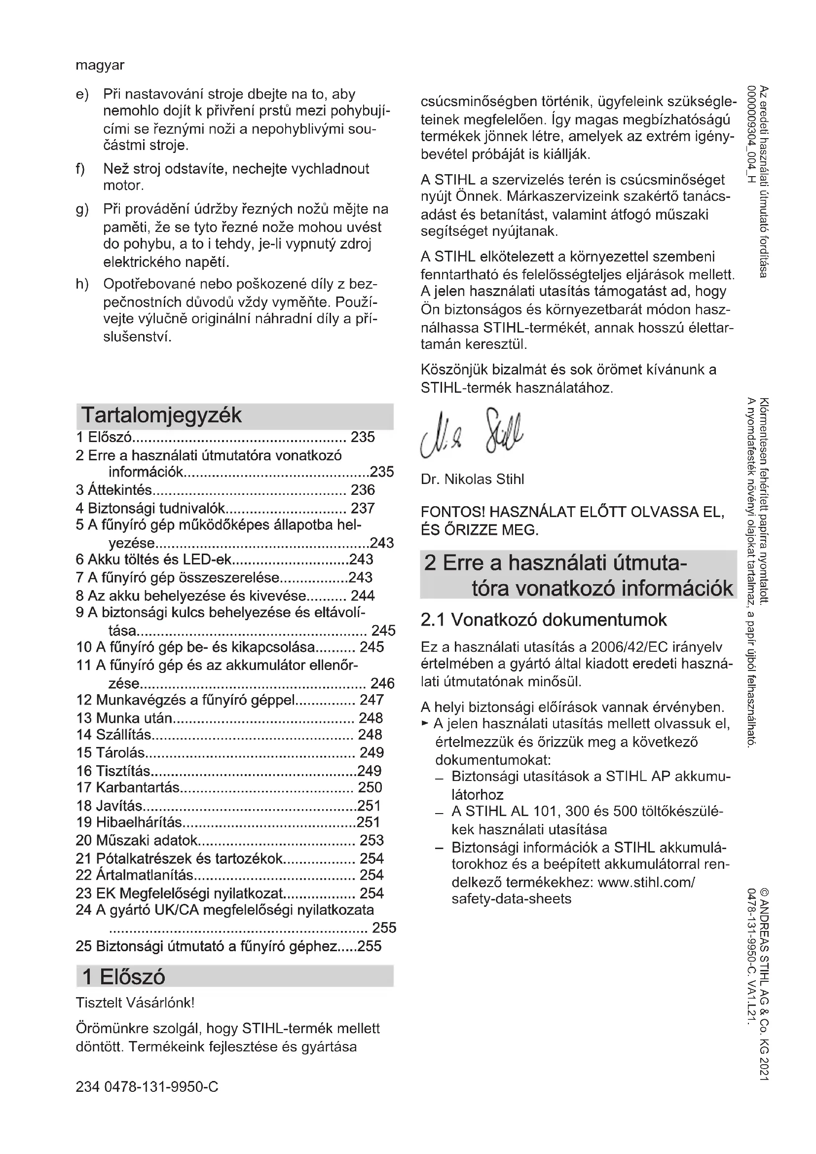 25 Biztonsági útmutató a fűnyíró géphez.....255 1 Előszó Tisztelt Vásárlónk! Örömünkre szolgál, hogy STIHL-termék mellett döntött. Termékeink fejlesztése és gyártása csúcsminőségben történik, ügyfeleink szükségle‐ teinek megfelelően. Így magas megbízhatóságú termékek jönnek létre, amelyek az extrém igény‐ bevétel próbáját is kiállják. A STIHL a szervizelés terén is csúcsminőséget nyújt Önnek. Márkaszervizeink szakértő tanács‐ adást és betanítást, valamint átfogó műszaki segítséget nyújtanak. A STIHL elkötelezett a környezettel szembeni fenntartható és felelősségteljes eljárások mellett. A jelen használati utasítás támogatást ad, hogy Ön biztonságos és környezetbarát módon hasz‐ nálhassa STIHL-termékét, annak hosszú élettar‐ tamán keresztül. Köszönjük bizalmát és sok örömet kívánunk a STIHL-termék használatához. Dr. Nikolas Stihl FONTOS! HASZNÁLAT ELŐTT OLVASSA EL, ÉS ŐRIZZE MEG. 2 Erre a használati útmuta‐ tóra vonatkozó információk