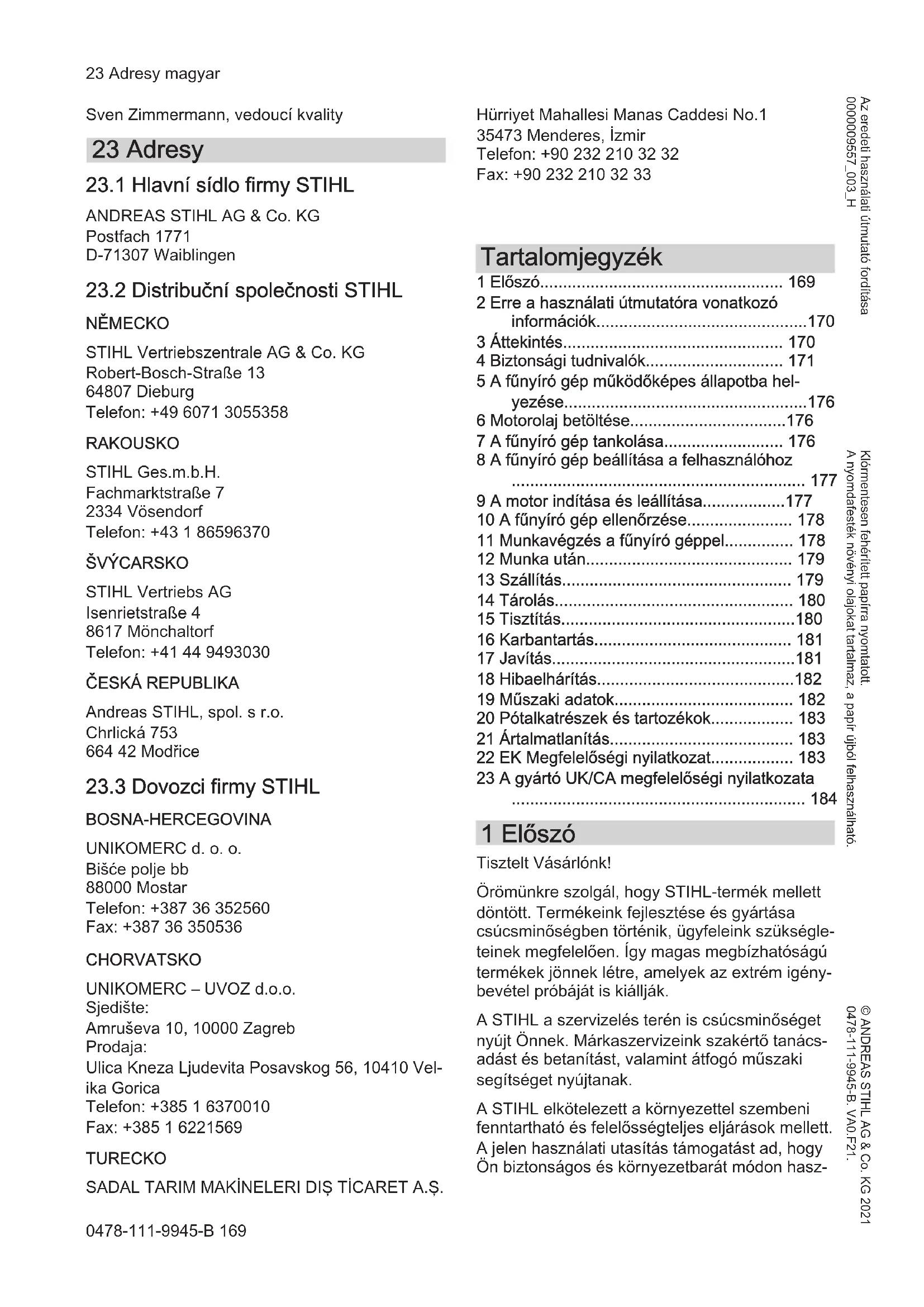 A muszaki dokumentáció a STIHL Tirol GmbH cecnél talalható.