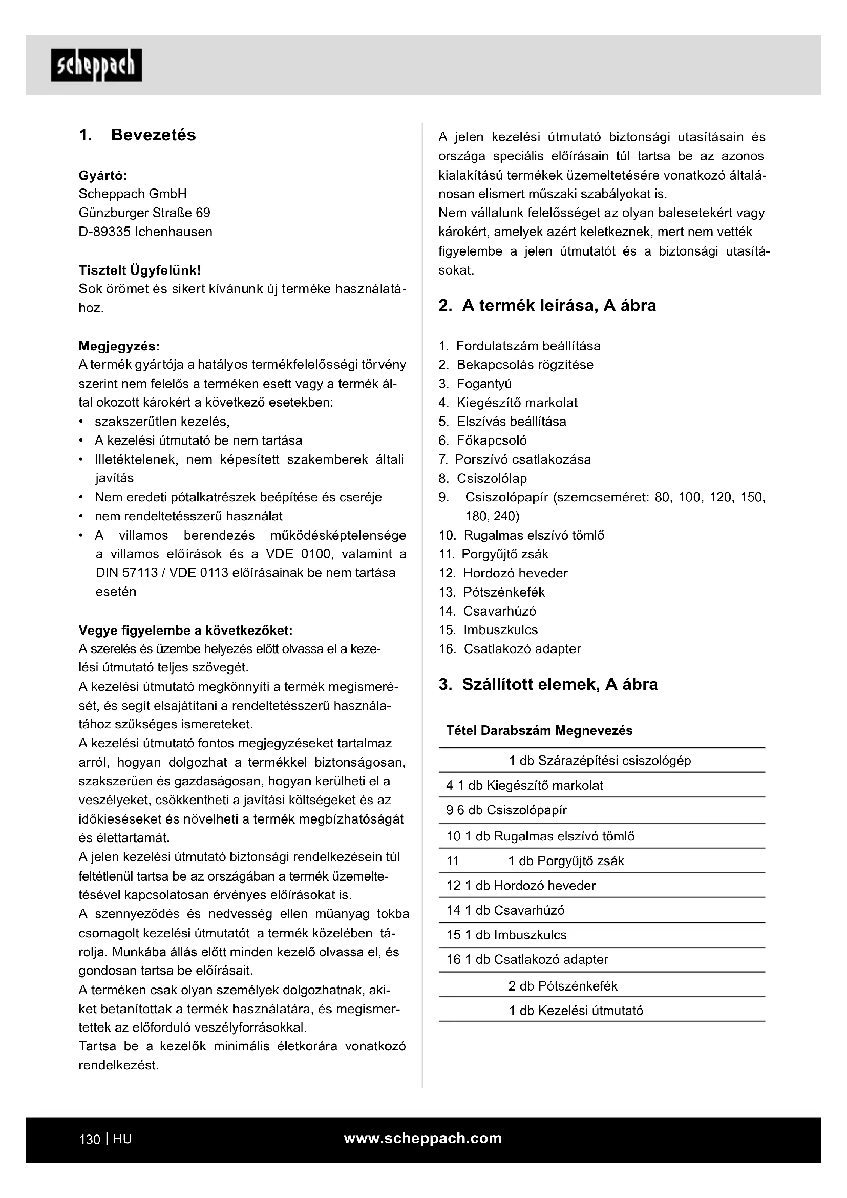- A villamos berendezés működésképtelensége a villamos előírások és a VDE 0100, valamint a DIN 57113 / VDE 0113 előírásainak be nem tartása esetén Vegye gyelembe a következőket: A szerelés és üzembe helyezés előtt olvassa el a keze- lési útmutató teljes szövegét. A kezelési útmutató megkönnyíti a termék megismeré- sét, és segít elsajátítani a rendeltetésszerű használa- tához szükséges ismereteket. A kezelési útmutató fontos megjegyzéseket tartalmaz arról, hogyan dolgozhat a termékkel biztonságosan, szakszerűen és gazdaságosan, hogyan kerülheti el a veszélyeket, csökkentheti a javítási költségeket és az időkieséseket és növelheti a termék megbízhatóságát és élettartamát. A jelen kezelési útmutató biztonsági rendelkezésein túl feltétlenül tartsa be az országában a termék üzemelte- tésével kapcsolatosan érvényes előírásokat is. A szennyeződés és nedvesség ellen műanyag tokba csomagolt kezelési útmutatót a termék közelében tá- rolja. Munkába állás előtt minden kezelő olvassa el, és gondosan tartsa be előírásait. A terméken csak olyan személyek dolgozhatnak, aki- ket betanítottak a termék használatára, és megismer- tettek az előforduló veszélyforrásokkal. Tartsa be a kezelők minimális életkorára vonatkozó rendelkezést.www.scheppach.com