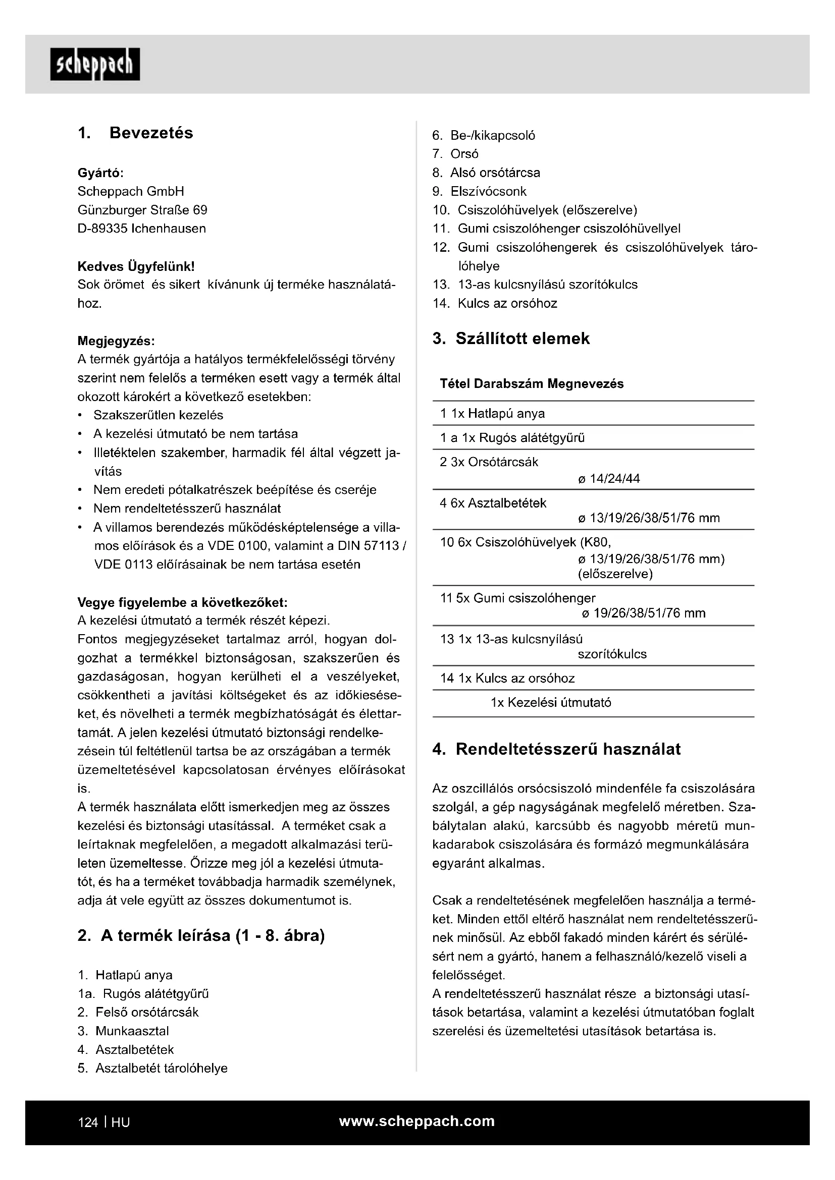 Az oszcillálós orsócsiszoló mindenféle fa csiszolására szolgál, a gép nagyságának megfelelő méretben. Sza- bálytalan alakú, karcsúbb és nagyobb méretű mun- kadarabok csiszolására és formázó megmunkálására egyaránt alkalmas. Csak a rendeltetésének megfelelően használja a termé- ket. Minden ettől eltérő használat nem rendeltetésszerű- nek minősül. Az ebből fakadó minden kárért és sérülé- sért nem a gyártó, hanem a felhasználó/kezelő viseli a felelősséget. A rendeltetésszerű használat része a biztonsági utasí- tások betartása, valamint a kezelési útmutatóban foglalt szerelési és üzemeltetési utasítások betartása is.