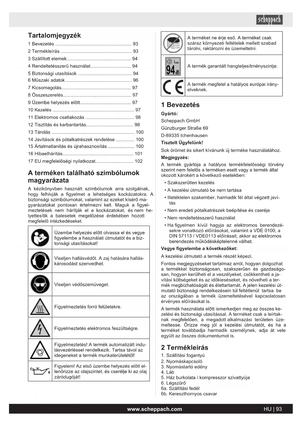 - 17 EU megfelelőségi nyilatkozat A terméken található szimbólumok magyarázata A kézikönyvben használt szimbólumok arra szolgálnak, hogy felhívják a figyelmet a lehetséges kockázatokra. A biztonsági szimbólumokat, valamint az ezeket kísérő ma- gyarázatokat pontosan értelmezni kell. Maguk a figyel- meztetések nem hárítják el a kockázatokat, és nem he- lyettesítik a balesetek megelőzése érdekében hozott megfelelő intézkedéseket. Üzembe helyezés előtt olvassa el és vegye figyelembe a használati útmutatót és a biz- tonsági utasításokat! Viseljen hallásvédőt. A zaj hatására hallás- károsodást szenvedhet. Viseljen védőszemüveget. Figyelmeztetés forró felületekre. Figyelmeztetés elektromos feszültségre. Figyelmeztetés! A termék automatizált indu- lásvezérléssel rendelkezik. Tartsa távol az idegeneket a termék munkaterületétől! Figyelem! Az első üzembe helyezés előtt el- lenőrizze az olajszintet, és cserélje ki az olaj záródugóját! A terméket ne érje eső. A terméket csak száraz környezeti feltételek mellett szabad tárolni, raktározni és üzemeltetni. A termék garantált hangteljesítményszintje. A termék megfelel a hatályos európai irány- elveknek. 1 Bevezetés Gyártó: Scheppach GmbH Günzburger Straße 69 D-89335 Ichenhausen Tisztelt Ügyfelünk! Sok örömet és sikert kívánunk új terméke használatához. Megjegyzés: A termék gyártója a hatályos termékfelelősségi törvény szerint nem felelős a terméken esett vagy a termék által okozott károkért a következő esetekben: p. 102