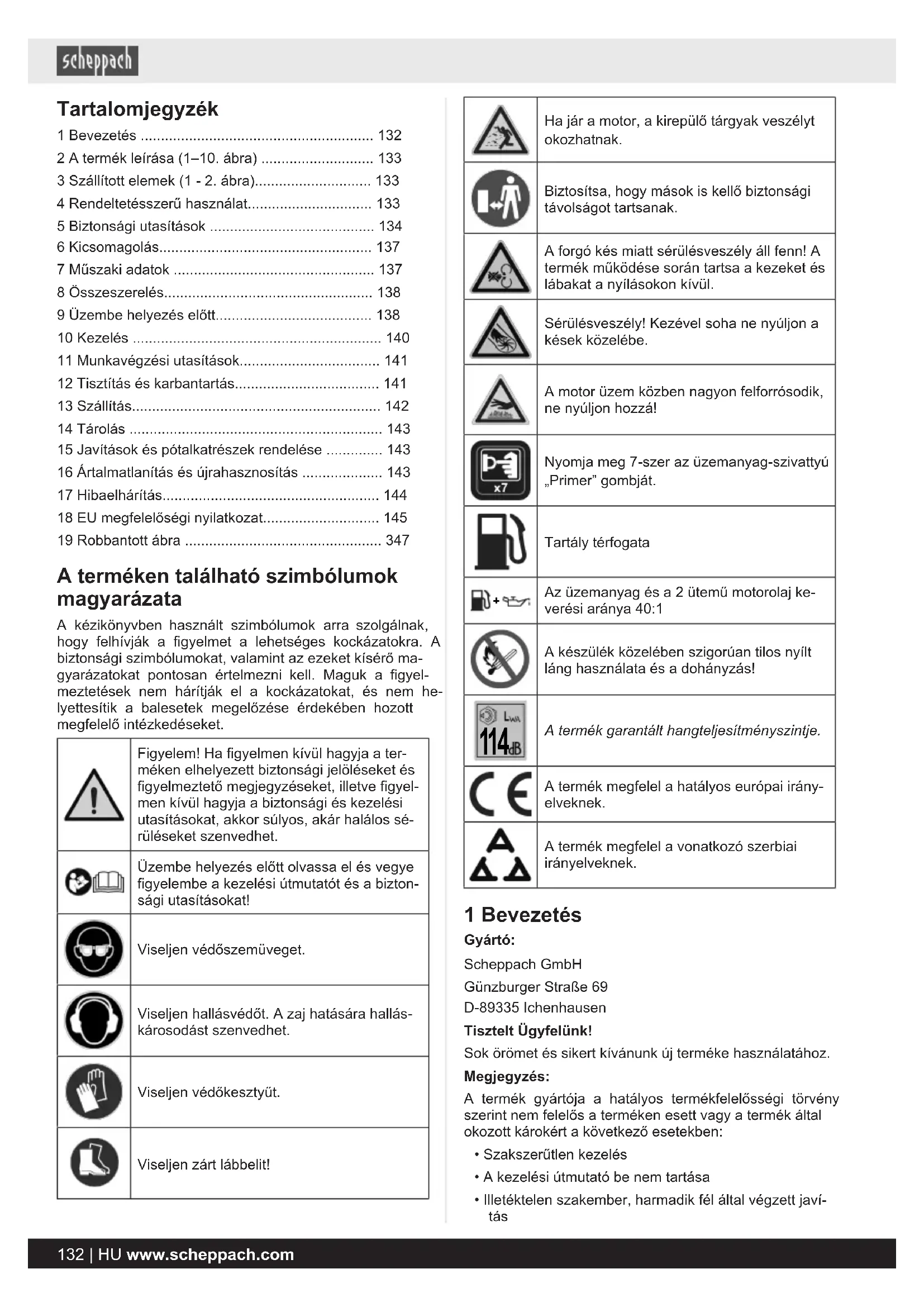 - Lomb vagy általános kerti hulladékok, mint pl. lemet- szett gallyak összehordására, illetve ezeknek a nehe- zen hozzáférhető helyekről való eltávolításához. Csak a rendeltetésének megfelelően használja a termé- ket. Minden ettől eltérő használat nem rendeltetésszerű- nek minősül. Az ebből fakadó minden kárért és sérülésért nem a gyártó, hanem a felhasználó viseli a felelősséget. A rendeltetésszerű használat része a biztonsági utasítá- sok betartása, valamint a kezelési útmutatóban foglalt szerelési és üzemeltetési utasítások betartása is. A terméket használó és karbantartó személyeknek ismer- niük kell ezeket, és tájékozottnak kell lenniük a lehetsé- ges veszélyekről. Ha a terméken módosítást végez, az ebből eredő káro- kért a gyártó nem vállal felelősséget. A terméket kizárólag a gyártó eredeti alkatrészeivel és eredeti tartozékaival szabad üzemeltetni. Tartsa be a gyártó biztonsági, munkavégzési és karban- tartási előírásait, valamint a műszaki adatokban meghatá- rozott méreteket. Kérjük, vegye figyelembe, hogy termékeinket rendelteté- sük szerint nem kisipari, kéziipari vagy ipari használatra tervezték. A termékre semmilyen garanciát nem vállalunk, ha kisipari, kéziipari vagy ipari, valamint ezekkel egyenér- tékű tevékenységekhez használja. A kezelési útmutatóban használt jelzőszavak magyarázata VESZÉLY Ez a jelzőszó olyan közvetlenül fenyegető ve- szélyes helyzetre utal, amely súlyos sérülést vagy halálos balesetet okoz, ha nem kerülik el. FIGYELMEZTETÉS Ez a jelzőszó olyan lehetséges veszélyhely- zetre utal, amely súlyos sérülést vagy halálos balesetet okozhat, ha nem kerülik el. VIGYÁZAT Ez a jelzőszó olyan lehetséges veszélyhely- zetre utal, amely csekélyebb vagy könnyebb sérülést okozhat, ha nem kerülik el. HU | 133www.scheppach.comFIGYELEM Ez a jelzőszó olyan lehetséges veszélyhely- zetre utal, amely anyagi járt okozhat a ter- mékben vagy más vagyontárgyakban/tulaj- donban, ha nem kerülik el. 5 Biztonsági utasítások Általános biztonsági utasítások FIGYELMEZTETÉS Kérjük, hogy a saját biztonsága érdekében a termék üzembe helyezése előtt figyelmesen olvassa el ezt a kézikönyvet és az általános biztonsági utasításokat. Ha a terméket továbbadja harmadik félnek, mindig mellé- kelje a használati utasítást is. FIGYELMEZTETÉS Csak a jelen útmutatóban javasolt üzemanyagokat használja. FIGYELMEZTETÉS Soha ne használjon olyan üzemanyagot, amely nincs 2 ütemű olajjal keverve. Ez maradandó motorkárosodást okozhat, és érvényteleníti a termékre vonatkozó gyártói jótállást. Soha ne használjon 90 napnál hosszabb ideig tárolt üzemanyag-keveréket. Az összes biztonsági utasítást és útmutatót őrizze meg későbbi használat céljából!