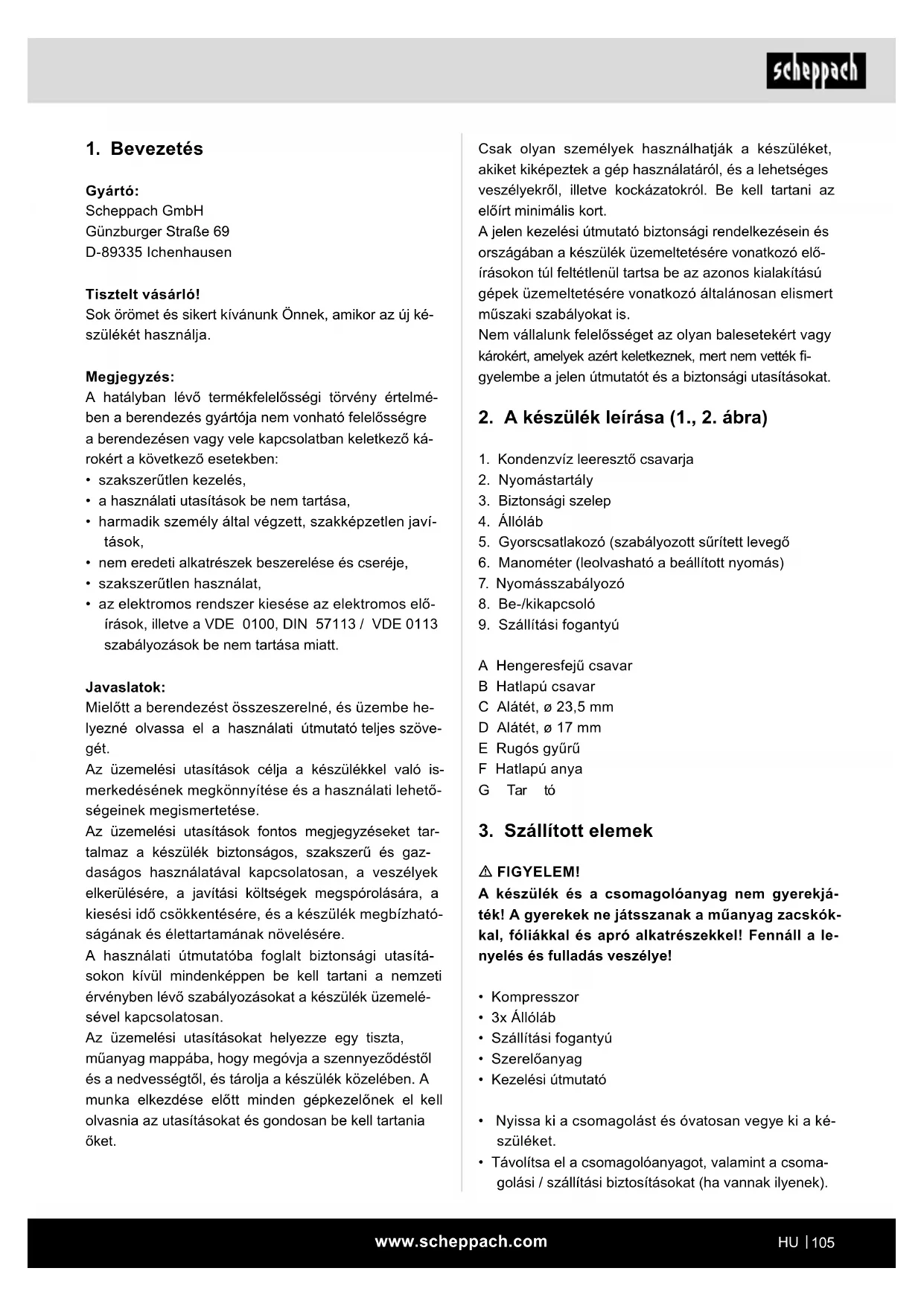- az elektromos rendszer kiesése az elektromos elő- írások, illetve a VDE 0100, DIN 57113 / VDE 0113 szabályozások be nem tartása miatt. Javaslatok: Mielőtt a berendezést összeszerelné, és üzembe he- lyezné olvassa el a használati útmutató teljes szöve- gét. Az üzemelési utasítások célja a készülékkel való is- merkedésének megkönnyítése és a használati lehető- ségeinek megismertetése. Az üzemelési utasítások fontos megjegyzéseket tar- talmaz a készülék biztonságos, szakszerű és gaz- daságos használatával kapcsolatosan, a veszélyek elkerülésére, a javítási költségek megspórolására, a kiesési idő csökkentésére, és a készülék megbízható- ságának és élettartamának növelésére. A használati útmutatóba foglalt biztonsági utasítá- sokon kívül mindenképpen be kell tartani a nemzeti érvényben lévő szabályozásokat a készülék üzemelé- sével kapcsolatosan. Az üzemelési utasításokat helyezze egy tiszta, műanyag mappába, hogy megóvja a szennyeződéstől és a nedvességtől, és tárolja a készülék közelében. A munka elkezdése előtt minden gépkezelőnek el kell olvasnia az utasításokat és gondosan be kell tartania őket.www.scheppach.com