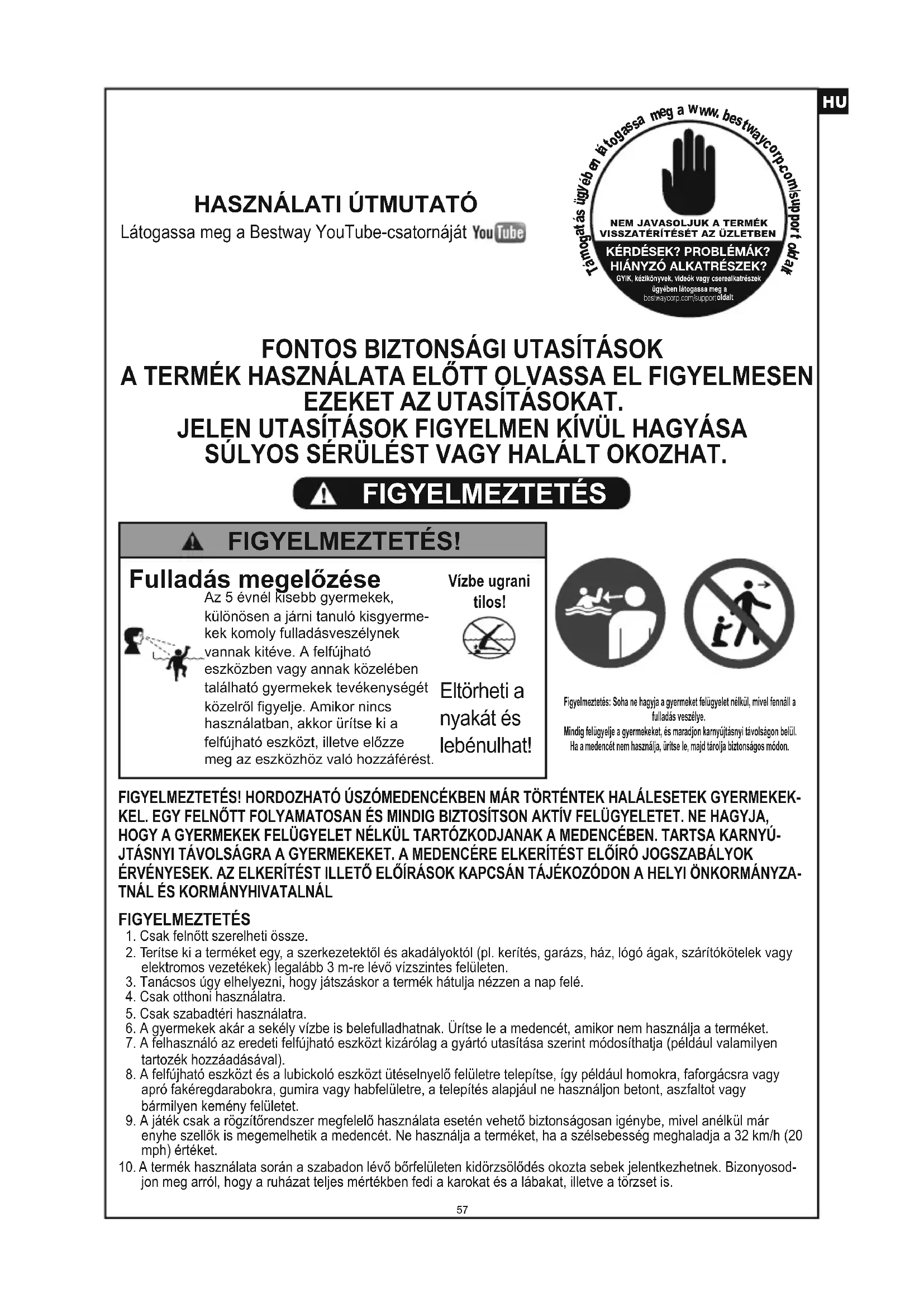 Fulladás megelőzése Az 5 évnél kisebb gyermekek, különösen a járni tanuló kisgyerme-kek komoly fulladásveszélynek vannak kitéve. A felfújható eszközben vagy annak közelében található gyermekek tevékenységét közelről figyelje. Amikor nincs használatban, akkor ürítse ki a felfújható eszközt, illetve előzze meg az eszközhöz való hozzáférést. FIGYELMEZTETÉS! Vízbe ugrani tilos! Eltörheti a nyakát és lebénulhat! 57FIGYELMEZTETÉS