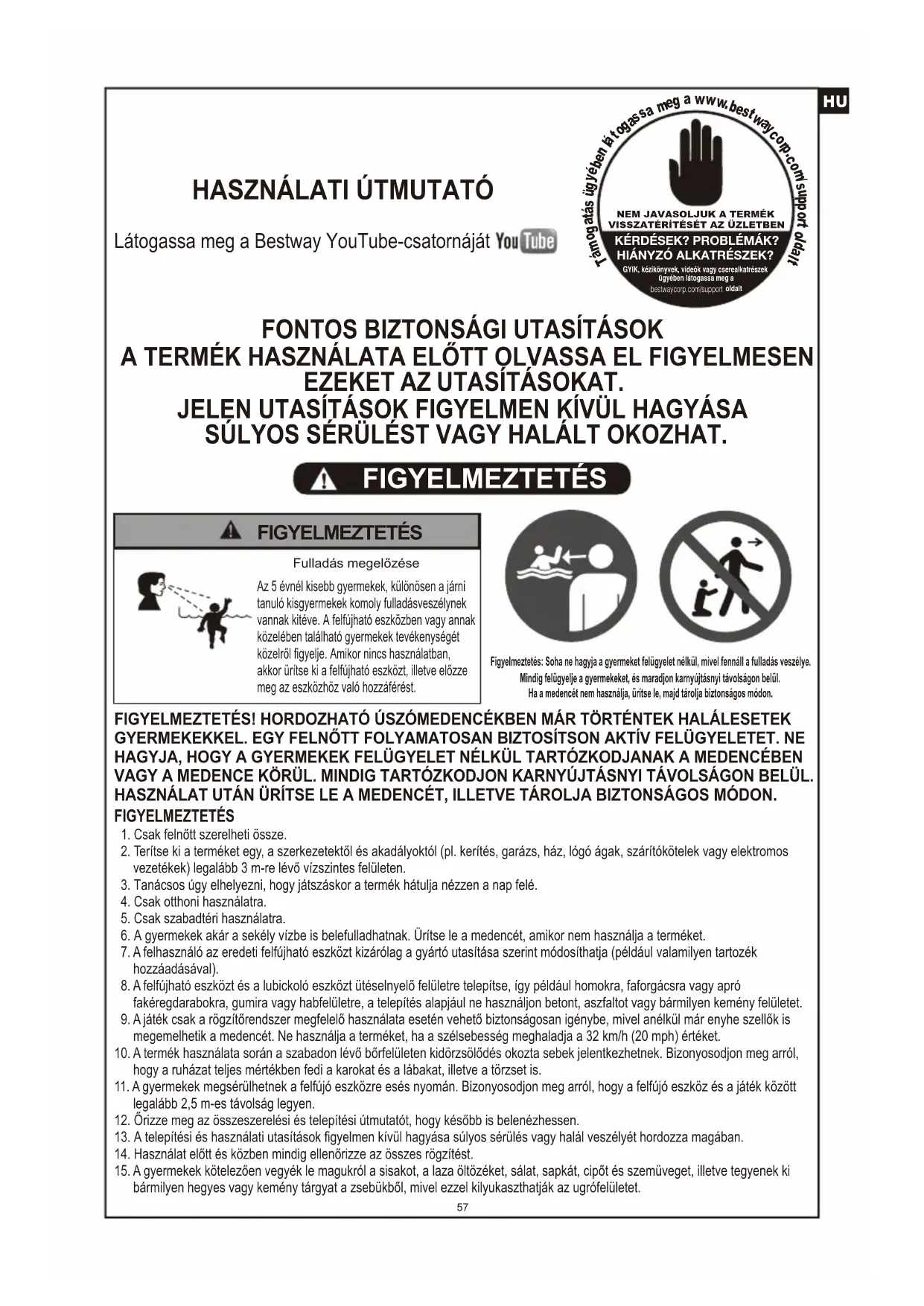 A TERMÉK HASZNÁLATA ELŐTT OLVASSA EL FIGYELMESEN EZEKET AZ UTASÍTÁSOKAT. JELEN UTASÍTÁSOK FIGYELMEN KÍVÜL HAGYÁSA SÚLYOS SÉRÜLÉST VAGY HALÁLT OKOZHAT. FIGYELMEZTETÉS Figyelmeztetés: Soha ne hagyja a gyermeket felügyelet nélkül, mivel fennáll a fulladás veszélye.Mindig felügyelje a gyermekeket, és maradjon karnyújtásnyi távolságon belül.Ha a medencét nem használja, ürítse le, majd tárolja biztonságos módon.Fulladás megelőzése FIGYELMEZTETÉS Az 5 évnél kisebb gyermekek, különösen a járni tanuló kisgyermekek komoly fulladásveszélynek vannak kitéve. A felfújható eszközben vagy annak közelében található gyermekek tevékenységét közelről figyelje. Amikor nincs használatban, akkor ürítse ki a felfújható eszközt, illetve előzze meg az eszközhöz való hozzáférést.FIGYELMEZTETÉS! HORDOZHATÓ ÚSZÓMEDENCÉKBEN MÁR TÖRTÉNTEK HALÁLESETEK GYERMEKEKKEL. EGY FELNŐTT FOLYAMATOSAN BIZTOSÍTSON AKTÍV FELÜGYELETET. NE HAGYJA, HOGY A GYERMEKEK FELÜGYELET NÉLKÜL TARTÓZKODJANAK A MEDENCÉBEN VAGY A MEDENCE KÖRÜL. MINDIG TARTÓZKODJON KARNYÚJTÁSNYI TÁVOLSÁGON BELÜL. HASZNÁLAT UTÁN ÜRÍTSE LE A MEDENCÉT, ILLETVE TÁROLJA BIZTONSÁGOS MÓDON.