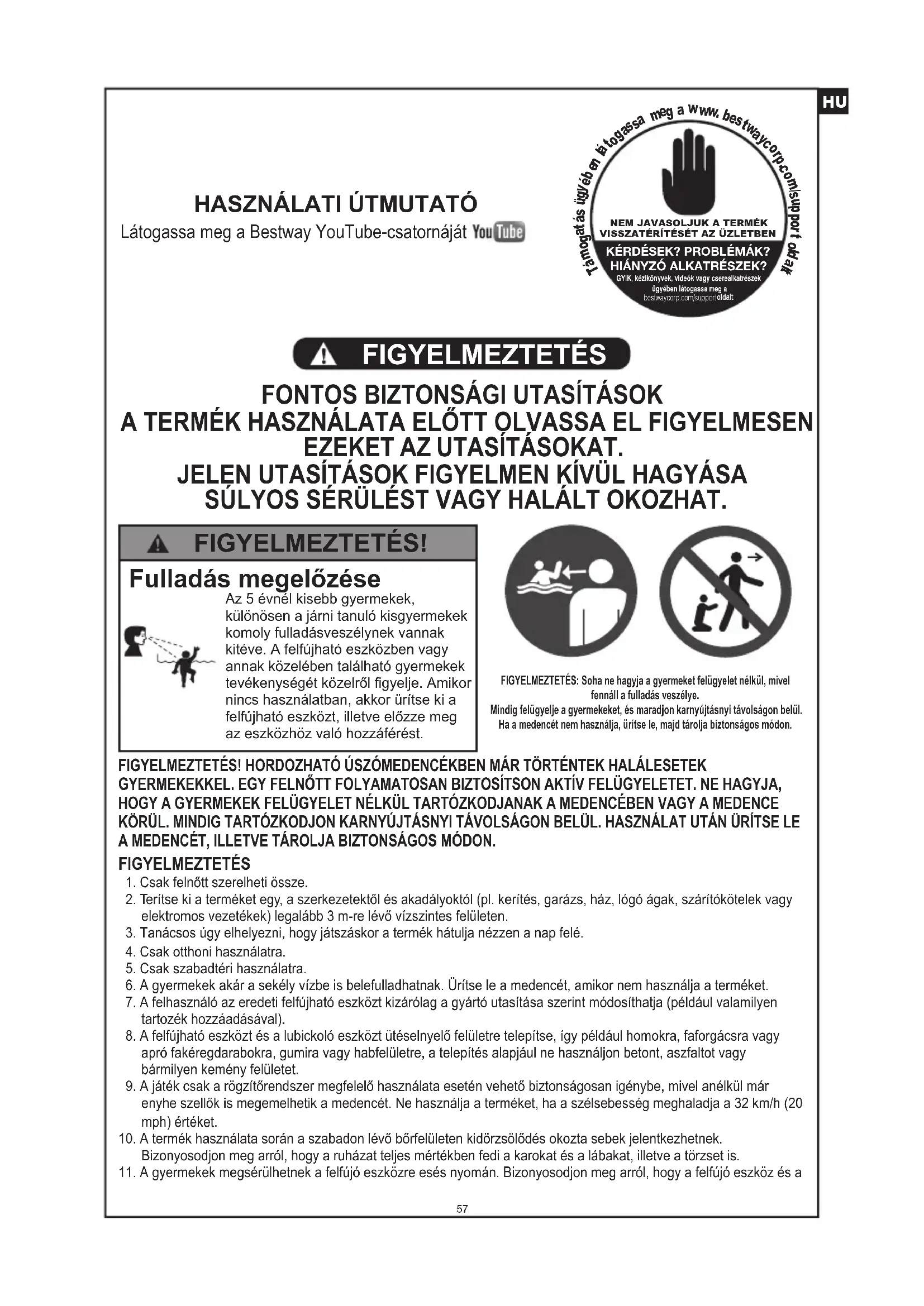 Fulladás megelőzése Az 5 évnél kisebb gyermekek, különösen a járni tanuló kisgyermekek komoly fulladásveszélynek vannak kitéve. A felfújható eszközben vagy annak közelében található gyermekek tevékenységét közelről figyelje. Amikor nincs használatban, akkor ürítse ki a felfújható eszközt, illetve előzze meg az eszközhöz való hozzáférést. FIGYELMEZTETÉS! FIGYELMEZTETÉS: Soha ne hagyja a gyermeket felügyelet nélkül, mivel fennáll a fulladás veszélye.Mindig felügyelje a gyermekeket, és maradjon karnyújtásnyi távolságon belül.Ha a medencét nem használja, ürítse le, majd tárolja biztonságos módon.FIGYELMEZTETÉS 1. Csak felnőtt szerelheti össze.