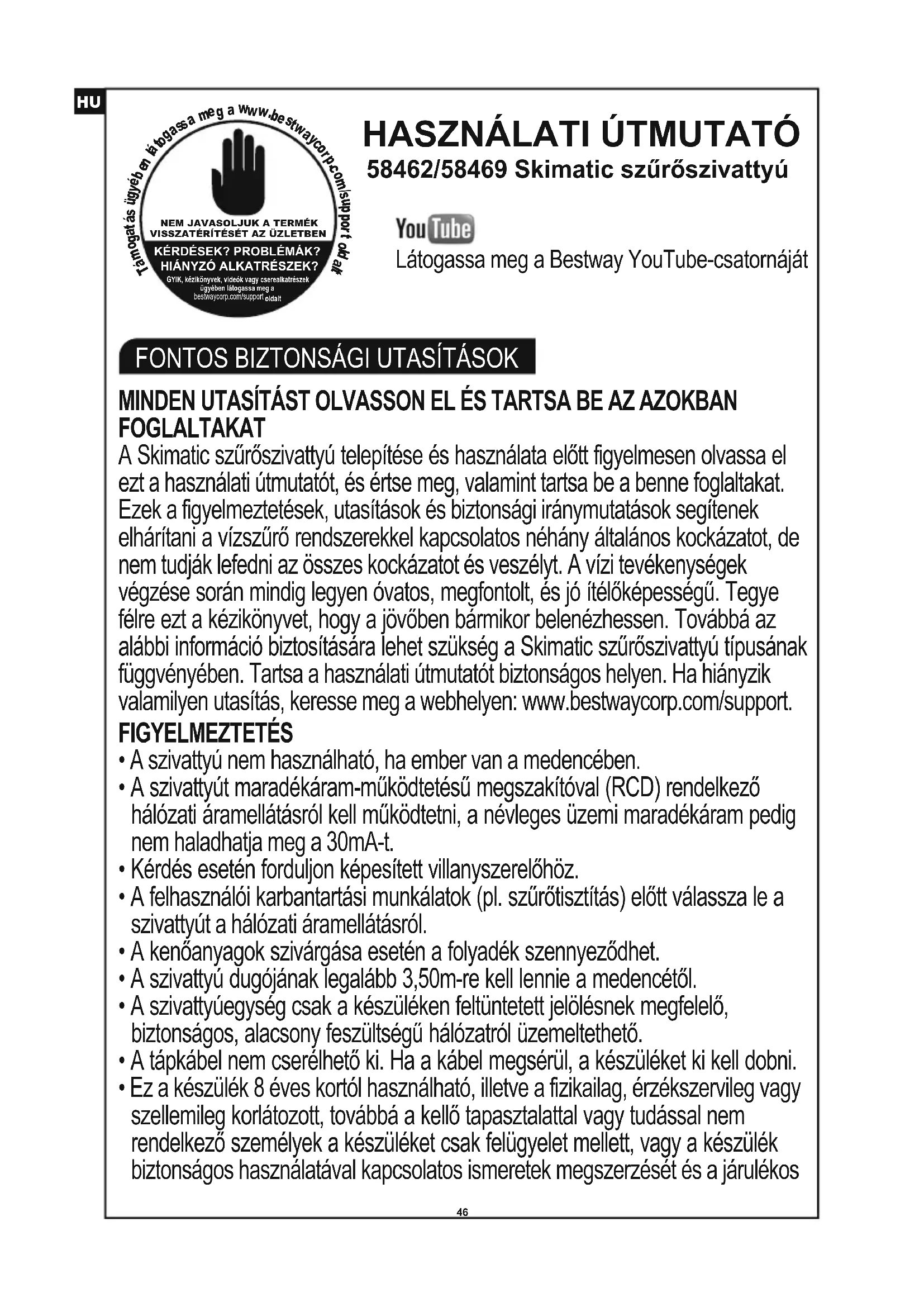 tÁRTALMATLANÍTÁS MINDEN UTASÍTÁST OLVASSON EL ÉS TARTSA BE AZ AZOKBAN FOGLALTAKAT A Skimatic szűrőszivattyú telepítése és használata előtt figyelmesen olvassa el ezt a használati útmutatót, és értse meg, valamint tartsa be a benne foglaltakat. Ezek a figyelmeztetések, utasítások és biztonsági iránymutatások segítenek elhárítani a vízszűrő rendszerekkel kapcsolatos néhány általános kockázatot, de nem tudják lefedni az összes kockázatot és veszélyt. A vízi tevékenységek végzése során mindig legyen óvatos, megfontolt, és jó ítélőképességű. Tegye félre ezt a kézikönyvet, hogy a jövőben bármikor belenézhessen. Továbbá az alábbi információ biztosítására lehet szükség a Skimatic szűrőszivattyú típusának függvényében. Tartsa a használati útmutatót biztonságos helyen. Ha hiányzik valamilyen utasítás, keresse meg a webhelyen: www.bestwaycorp.com/support. FIGYELMEZTETÉS
