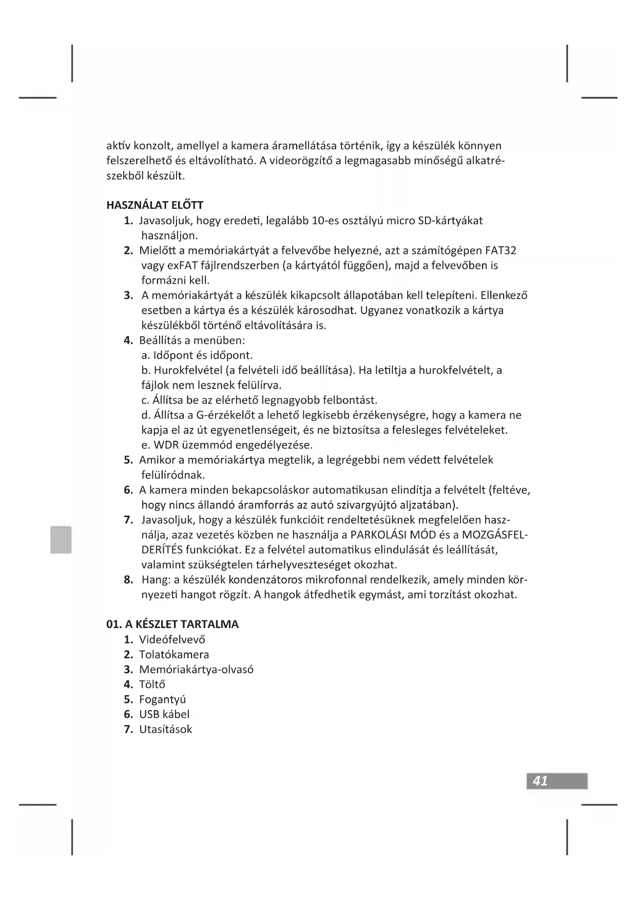 Jól zsírtalanítsa a felületeket, mielő a tartót az üvegre szerelné. Ne feledje, hogy kerülje a magas hőmérsékletet, amely a tartó deformációját és magának a felvevőnek a károsodását okozhatja. MEGJEGYZÉSEK: - G-SENSOR - egy olyan funkció, amelynek köszönhetően a rögzíte túlterheléssel (pl. egyenetlen útfelület, fékezés, járdaszegélyen vagy fekvőrendőrön való áthajtás stb.) rögzíte felvételek védve vannak a felülírástól. Ha ezt a funkciót használja, akkor a memóriakártyát rendszeresen formáznia kell a számítógépen, majd a fényképezőgépen. Végső soron az adathordozón lévő minden egyes fájl védve lesz a felülírástól, és a készülék nem lesz képes további útvonalat rögzíteni - nem fog hurokban rögzíteni. Javasoljuk, hogy az érzékelőt a vezetési slusának és az útviszonyoknak megfelelően állítsa be. Az opció teljesen kikapcsolható is, ebben az esetben minden egyes legrégebbi fájl felülírásra kerül, és a kártyát nem kell rendszeresen formázni. - PARKING MODE/MONITOR - a funkciót úgy tervezték, hogy a jármű parkolása közben is működjön, az akkumulátort* használja, ha a DVR teljesen fel van töltve - (*ha van beépíte akkumulátora) . Ebben az esetben a kamera az ütés érzékelése után néhány másodperces videofelvételt kezd el rögzíteni - amíg az akkumulátor le nem merül. A funkció használatakor vegye gyelembe a készülék akkumulátorát, amelyet a funkció akválása (elindítása) után fel kell tölteni. Mielő útnak indulna, érdemes kikapcsolni a funkciót, mivel a kamera ennek hatására be- és kikapcsolhat, és véletlenszerűen töredékes felvételeket készíthet az útvonalról. *A járműben lévő állandó áramellátás mia ez a funkció másképp viselkedhet, pl. a kamera bekapcsolva hagyása, ami lemeríthe az autó akkumulátorát. - A MOZGÁSFELDERÍTÉS - a jármű parkolása közbeni működésre terveze funkció - állandó áramellátást igényel, és a kamerának bekapcsolva kell maradnia. A DVR automakusan megkezdi a felvételt, amikor mozgást észlel, és néhány másodperc- cel azután, hogy a kamera lencséje elő nem történik mozgás, leállítja a felvételt. Kérjük, vegye gyelembe, hogy ez a funkció lemeríthe a gépkocsi akkumulátorát. Indulás elő ki kell kapcsolnia a funkciót, mivel a kamera be- és kikapcsolhat, és véletlenszerű töredékeket készíthet az útvonal felvételéből. FIGYELEM: A készülék beépíte kondenzátorral rendelkezik, és csak külső tápe- gységgel működik. MEGJEGYZÉS: Csak az erede töltőt használja 5V/2,5A töltési árammal. (Ne csatlakoztassa közvetlenül 220/230V-os aljzathoz). Az utasítások be nem tartása károsíthatja a fényképezőgépet, vagy veszélyes helyzetekhez vezethet.49