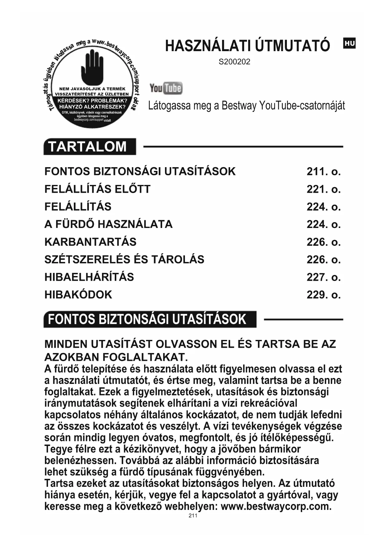 www.bestwaycorp.com. Wykryto elektryczność z przewodu uziemiającegoFONTOS BIZTONSÁGI UTASÍTÁSOK MINDEN UTASÍTÁST OLVASSON EL ÉS TARTSA BE AZ AZOKBAN FOGLALTAKAT. A fürdő telepítése és használata előtt figyelmesen olvassa el ezt a használati útmutatót, és értse meg, valamint tartsa be a benne foglaltakat. Ezek a figyelmeztetések, utasítások és biztonsági iránymutatások segítenek elhárítani a vízi rekreációval kapcsolatos néhány általános kockázatot, de nem tudják lefedni az összes kockázatot és veszélyt. A vízi tevékenységek végzése során mindig legyen óvatos, megfontolt, és jó ítélőképességű. Tegye félre ezt a kézikönyvet, hogy a jövőben bármikor belenézhessen. Továbbá az alábbi információ biztosítására lehet szükség a fürdő típusának függvényében. Tartsa ezeket az utasításokat biztonságos helyen. Az útmutató hiánya esetén, kérjük, vegye fel a kapcsolatot a gyártóval, vagy keresse meg a következő webhelyen: www.bestwaycorp.com.