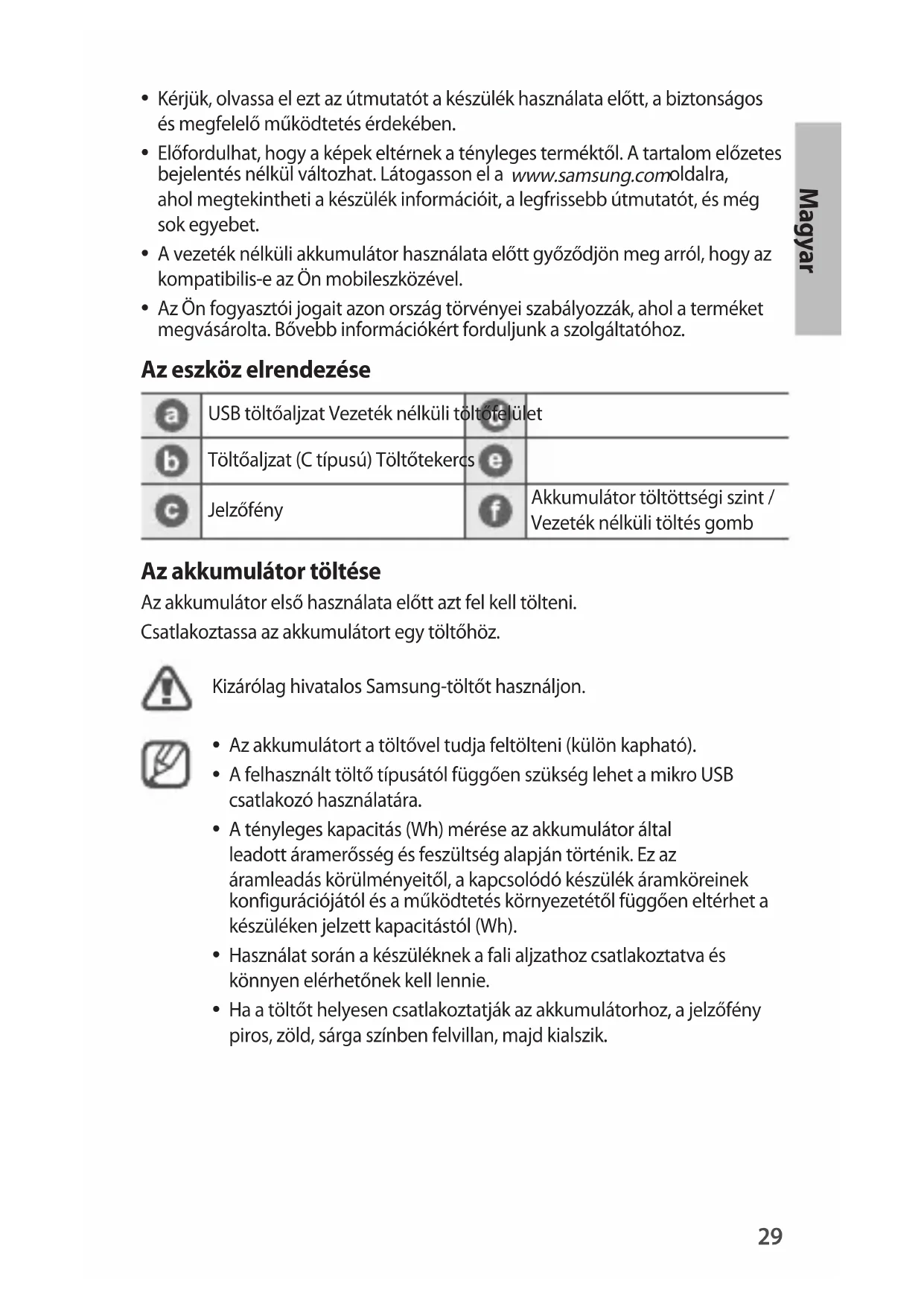 - A felhasznált tólto típusától fuggöen szükség lehet a mikro USB csatlakozó használatára.