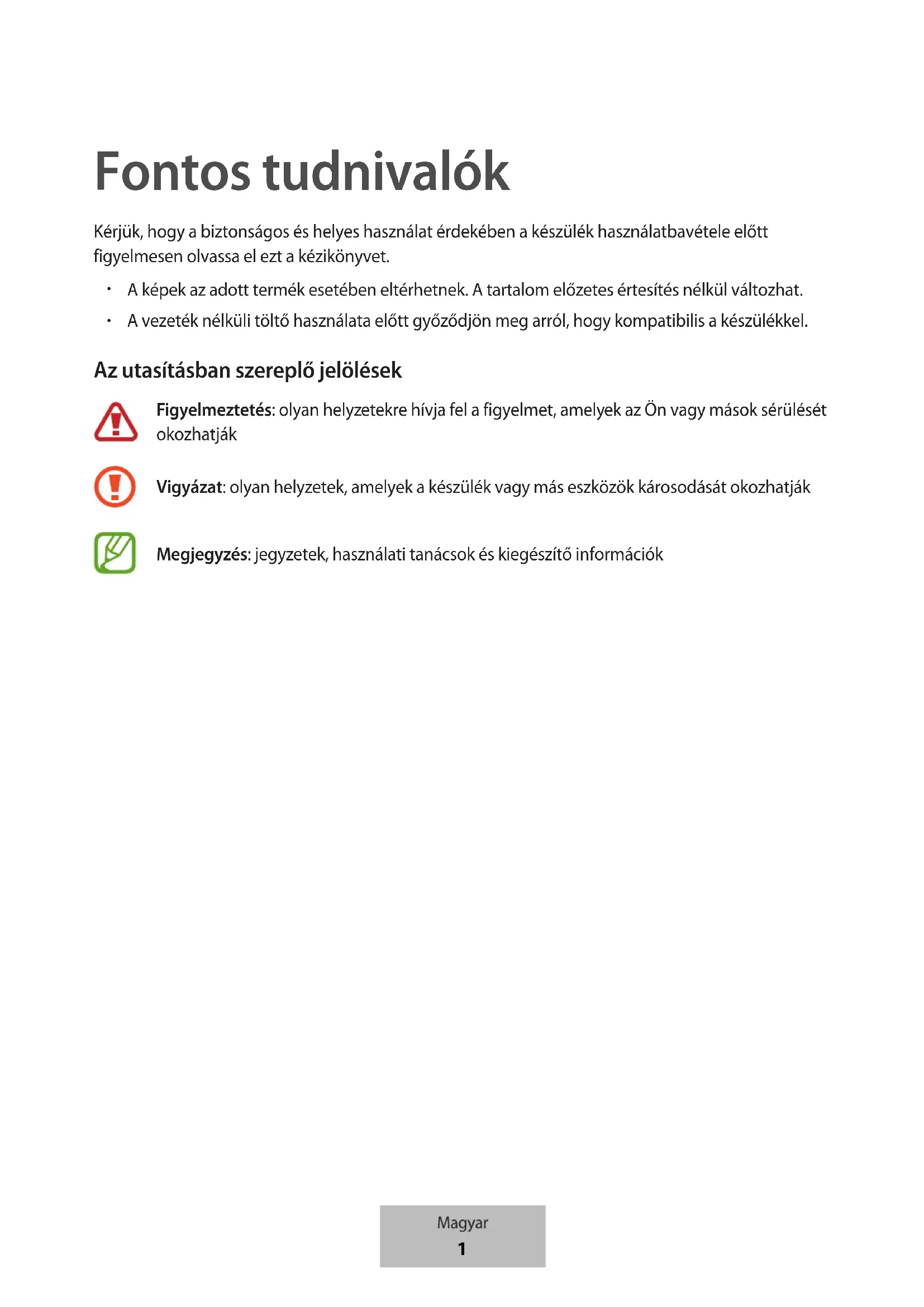A vezeték nélküli töltő használata előtt győződjön meg arról, hogy kompatibilis a készülékkel. Az utasításban szereplő jelölések Figyelmeztetés: olyan helyzetekre hívja fel a figyelmet, amelyek az Ön vagy mások sérülését okozhatják Vigyázat: olyan helyzetek, amelyek a készülék vagy más eszközök károsodását okozhatják Megjegyzés: jegyzetek, használati tanácsok és kiegészítő információk Magyar