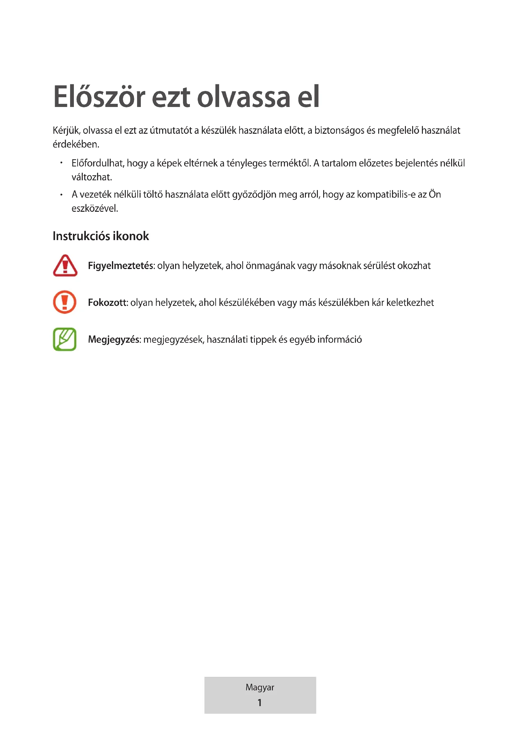 A vezeték nélküli töltő használata előtt győződjön meg arról, hogy az kompatibilis-e az Ön eszközével. Instrukciós ikonok Figyelmeztetés: olyan helyzetek, ahol önmagának vagy másoknak sérülést okozhat Fokozott: olyan helyzetek, ahol készülékében vagy más készülékben kár keletkezhet Megjegyzés: megjegyzések, használati tippek és egyéb információ2 Magyar Használatbavétel A csomag tartalma A termék dobozában a következőket kell találnia: