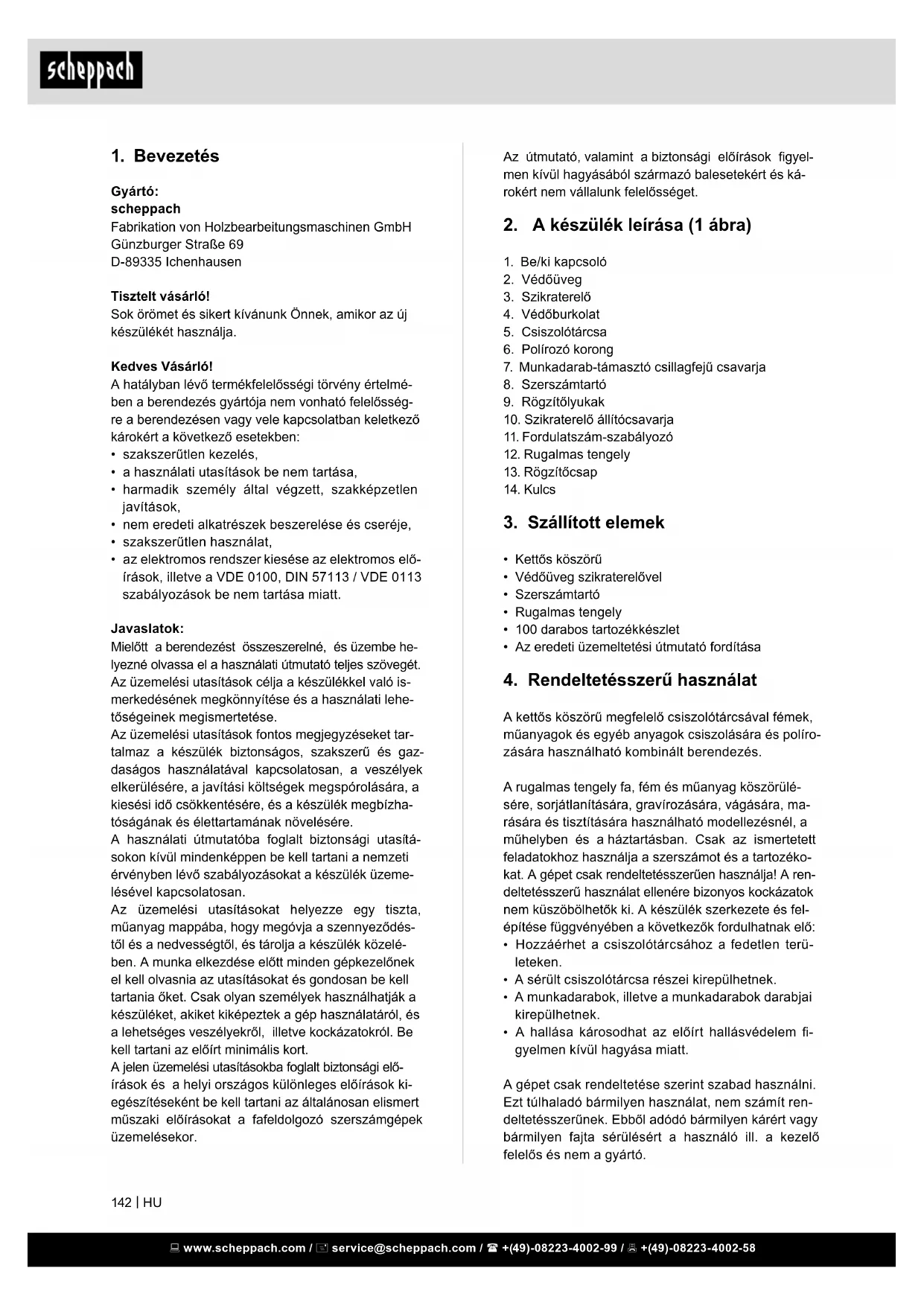 - Óvatosan és gondosan kezelje a készüléket. A berendezést tartsa tisztán, szárazon és az olaj- és kenőzsír-maradékoktól mentesen. www.scheppach.com / service@scheppach.com / +(49)-08223-4002-99 / +(49)-08223-4002-58
