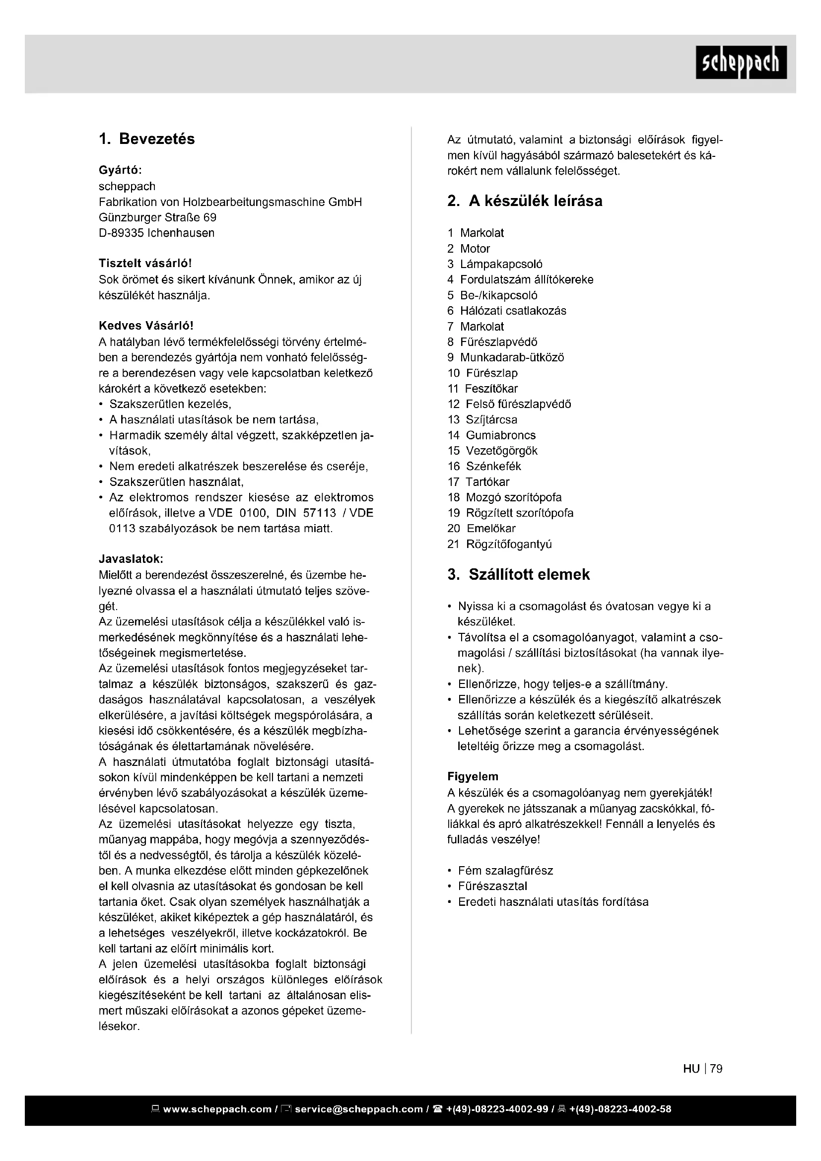 - Az elektromos rendszer kiesése az elektromos előírások, illetve a VDE 0100, DIN 57113 / VDE 0113 szabályozások be nem tartása miatt. Javaslatok: Mielőtt a berendezést összeszerelné, és üzembe he- lyezné olvassa el a használati útmutató teljes szöve- gét. Az üzemelési utasítások célja a készülékkel való is- merkedésének megkönnyítése és a használati lehe- tőségeinek megismertetése. Az üzemelési utasítások fontos megjegyzéseket tar- talmaz a készülék biztonságos, szakszerű és gaz- daságos használatával kapcsolatosan, a veszélyek elkerülésére, a javítási költségek megspórolására, a kiesési idő csökkentésére, és a készülék megbízha- tóságának és élettartamának növelésére. A használati útmutatóba foglalt biztonsági utasítá- sokon kívül mindenképpen be kell tartani a nemzeti érvényben lévő szabályozásokat a készülék üzeme- lésével kapcsolatosan. Az üzemelési utasításokat helyezze egy tiszta, műanyag mappába, hogy megóvja a szennyeződés- től és a nedvességtől, és tárolja a készülék közelé- ben. A munka elkezdése előtt minden gépkezelőnek el kell olvasnia az utasításokat és gondosan be kell tartania őket. Csak olyan személyek használhatják a készüléket, akiket kiképeztek a gép használatáról, és a lehetséges veszélyekről, illetve kockázatokról. Be kell tartani az előírt minimális kort. A jelen üzemelési utasításokba foglalt biztonsági előírások és a helyi országos különleges előírások kiegészítéseként be kell tartani az általánosan elis- mert műszaki előírásokat a azonos gépeket üzeme- lésekor. www.scheppach.com / service@scheppach.com / +(49)-08223-4002-99 / +(49)-08223-4002-58