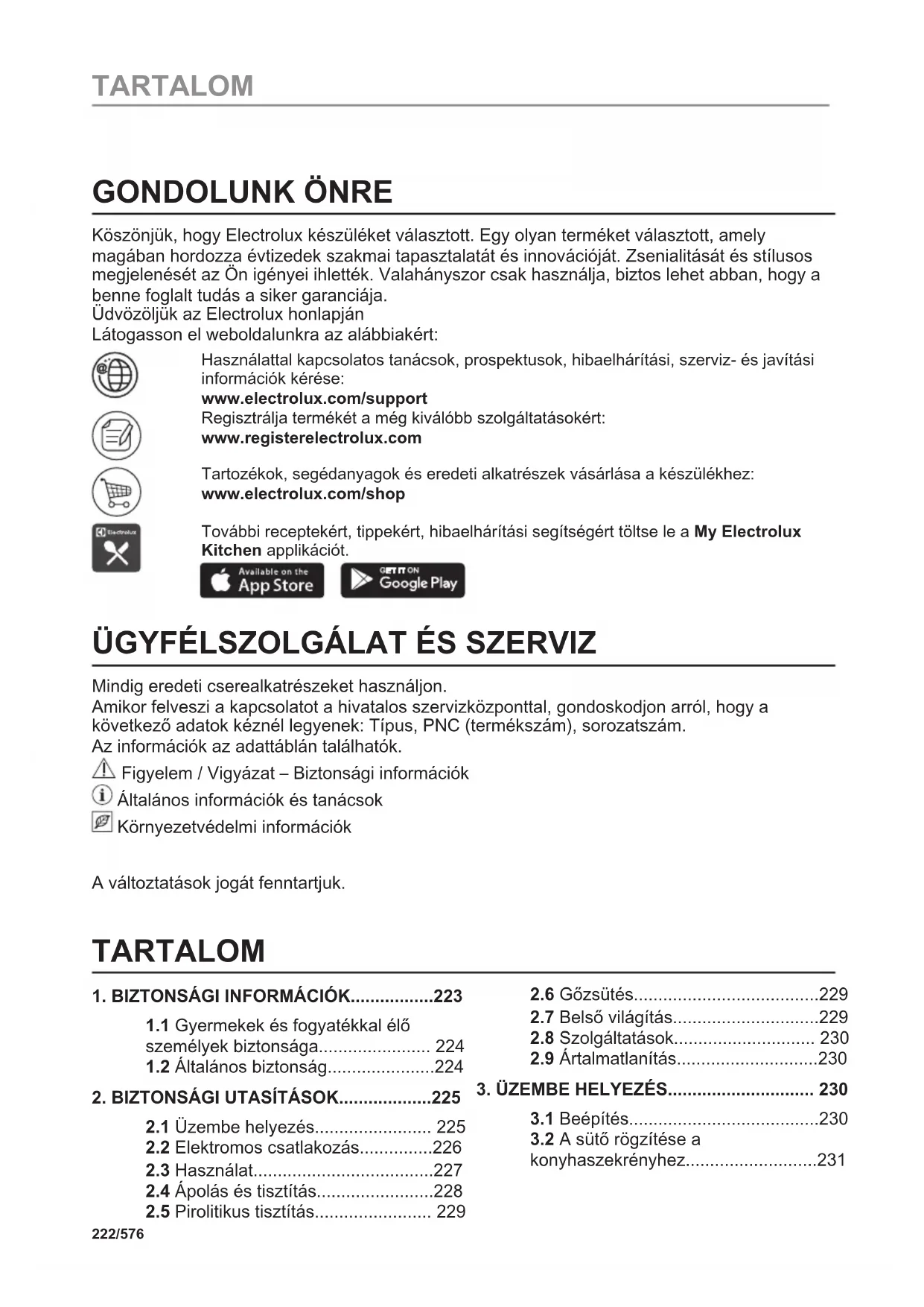Köszönjük, hogy Electrolux készüléket választott. Egy olyan terméket választott, amely magában hordozza évtizedek szakmai tapasztalatát és innovációját. Zsenialitását és stílusos megjelenését az Ön igényei ihlették. Valahányszor csak használja, biztos lehet abban, hogy a benne foglalt tudás a siker garanciája. Üdvözöljük az Electrolux honlapján Látogasson el weboldalunkra az alábbiakért: Használattal kapcsolatos tanácsok, prospektusok, hibaelhárítási, szerviz- és javítási információk kérése: www.electrolux.com/support Regisztrálja termékét a még kiválóbb szolgáltatásokért: www.registerelectrolux.com Tartozékok, segédanyagok és eredeti alkatrészek vásárlása a készülékhez: www.electrolux.com/shop További receptekért, tippekért, hibaelhárítási segítségért töltse le a My Electrolux Kitchen applikációt.