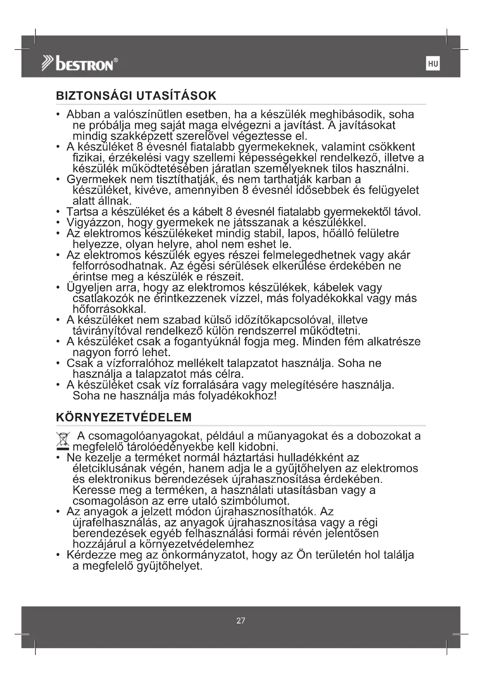 - A keszüléket 8 évesnel fiatalabb gyermekeknek, valamint csökkent fizikai, érzekelési vagy szellemi képességekkel rendelkező, illetve a keszülék muködtetésen járatlan szemelyeknek tilos használni.