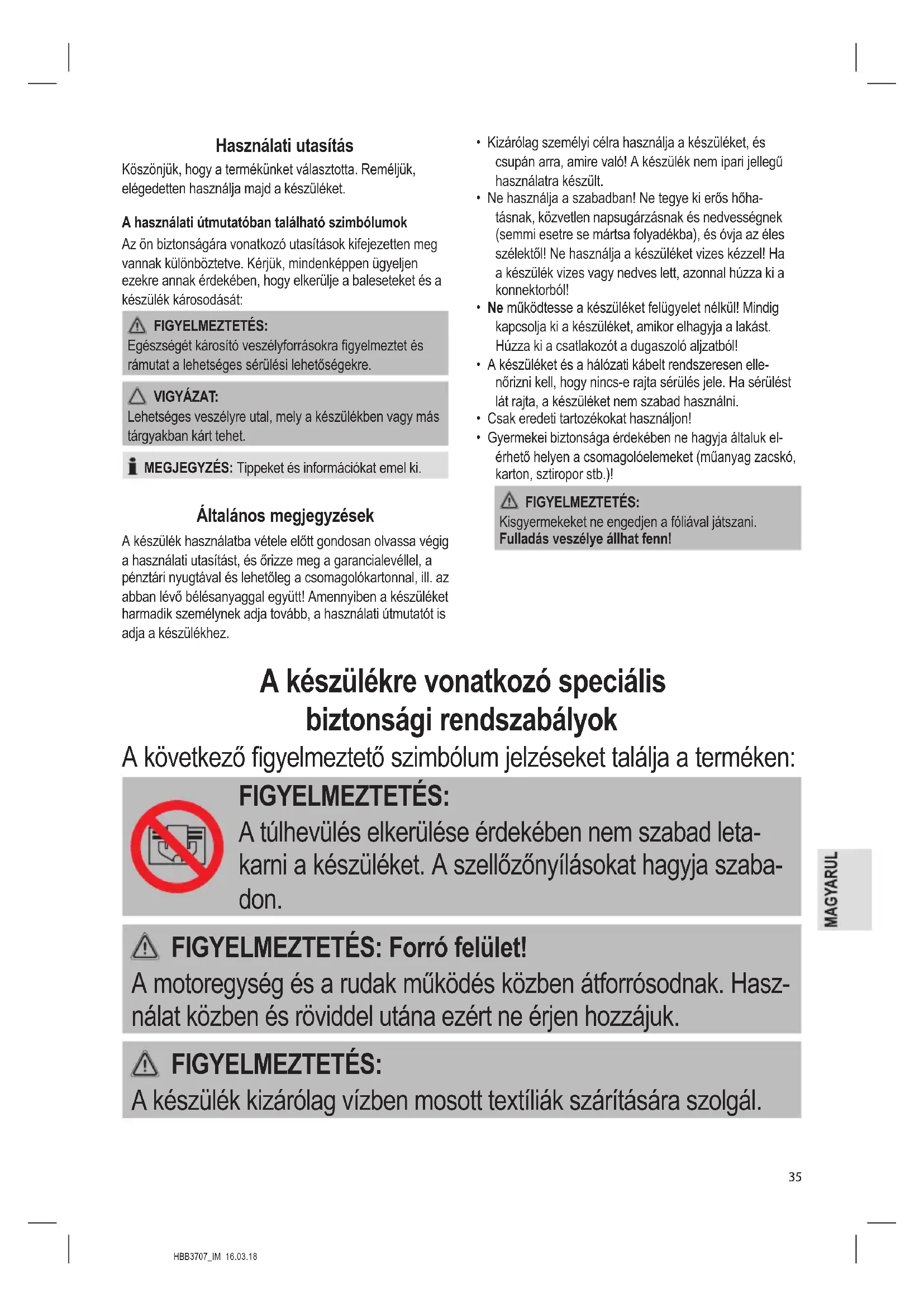 - Gyermekei biztonsága érdekében ne hagyja általuk el- érhető helyen a csomagolóelemeket (műanyag zacskó, karton, sztiropor stb.)! FIGYELMEZTETÉS: Kisgyermekeket ne engedjen a fóliával játszani. Fulladás veszélye állhat fenn! A készülékre vonatkozó speciális biztonsági rendszabályok A következő gyelmeztető szimbólum jelzéseket találja a terméken: FIGYELMEZTETÉS: A túlhevülés elkerülése érdekében nem szabad leta- karni a készüléket. A szellőzőnyílásokat hagyja szaba- don. FIGYELMEZTETÉS: Forró felület! A motoregység és a rudak működés közben átforrósodnak. Hasz- nálat közben és röviddel utána ezért ne érjen hozzájuk. FIGYELMEZTETÉS: A készülék kizárólag vízben mosott textíliák szárítására szolgál.HBB3707_IM 16.03.18