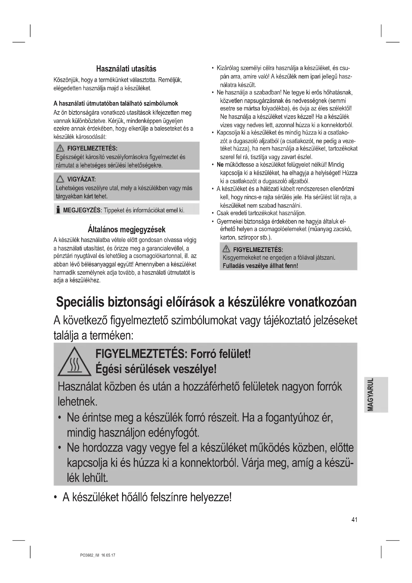 - Gyermekei biztonsága érdekében ne hagyja általuk el- érhető helyen a csomagolóelemeket (műanyag zacskó, karton, sztiropor stb.). FIGYELMEZTETÉS: Kisgyermekeket ne engedjen a fóliával játszani. Fulladás veszélye állhat fenn! Speciális biztonsági előírások a készülékre vonatkozóan A következő gyelmeztető szimbólumokat vagy tájékoztató jelzéseket találja a terméken: FIGYELMEZTETÉS: Forró felület! Égési sérülések veszélye! Használat közben és után a hozzáférhető felületek nagyon forrók lehetnek.