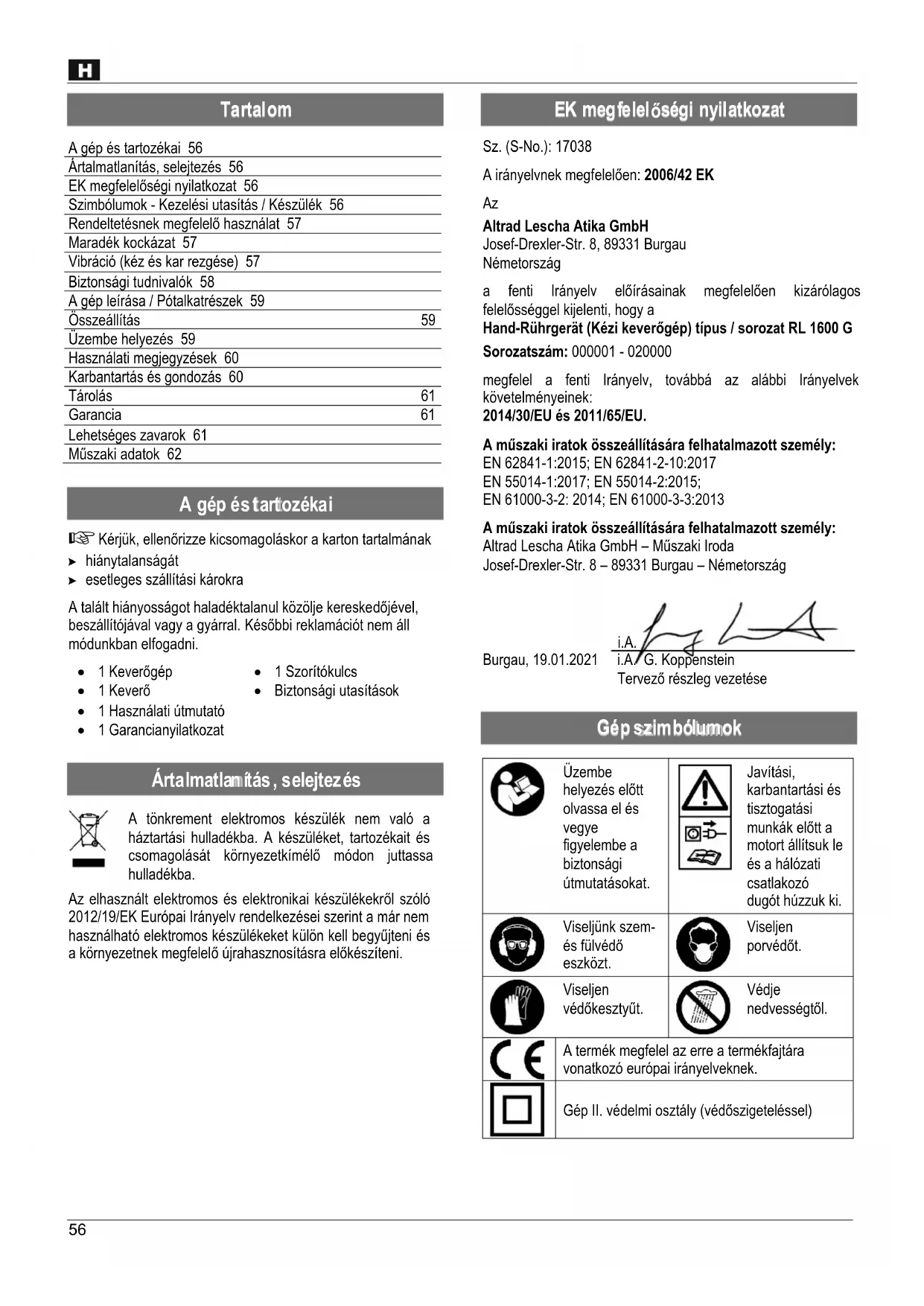 Altrad Lescha Atika GmbH Josef-Drexler-Str. 8, 89331 Burgau Németország a fenti Irányelv előírásainak megfelelően kizárólagos felelősséggel kijelenti, hogy a Hand-Rührgerät (Kézi keverőgép) típus / sorozat RL 1600 G Sorozatszám: 000001 - 020000 megfelel a fenti Irányelv, továbbá az alábbi Irányelvek követelményeinek: 2014/30/EU és 2011/65/EU. A műszaki iratok összeállítására felhatalmazott személy: EN 62841-1:2015; EN 62841-2-10:2017 EN 55014-1:2017; EN 55014-2:2015; EN 61000-3-2: 2014; EN 61000-3-3:2013 A műszaki iratok összeállítására felhatalmazott személy: Altrad Lescha Atika GmbH – Műszaki Iroda Josef-Drexler-Str. 8 – 89331 Burgau – Németország
