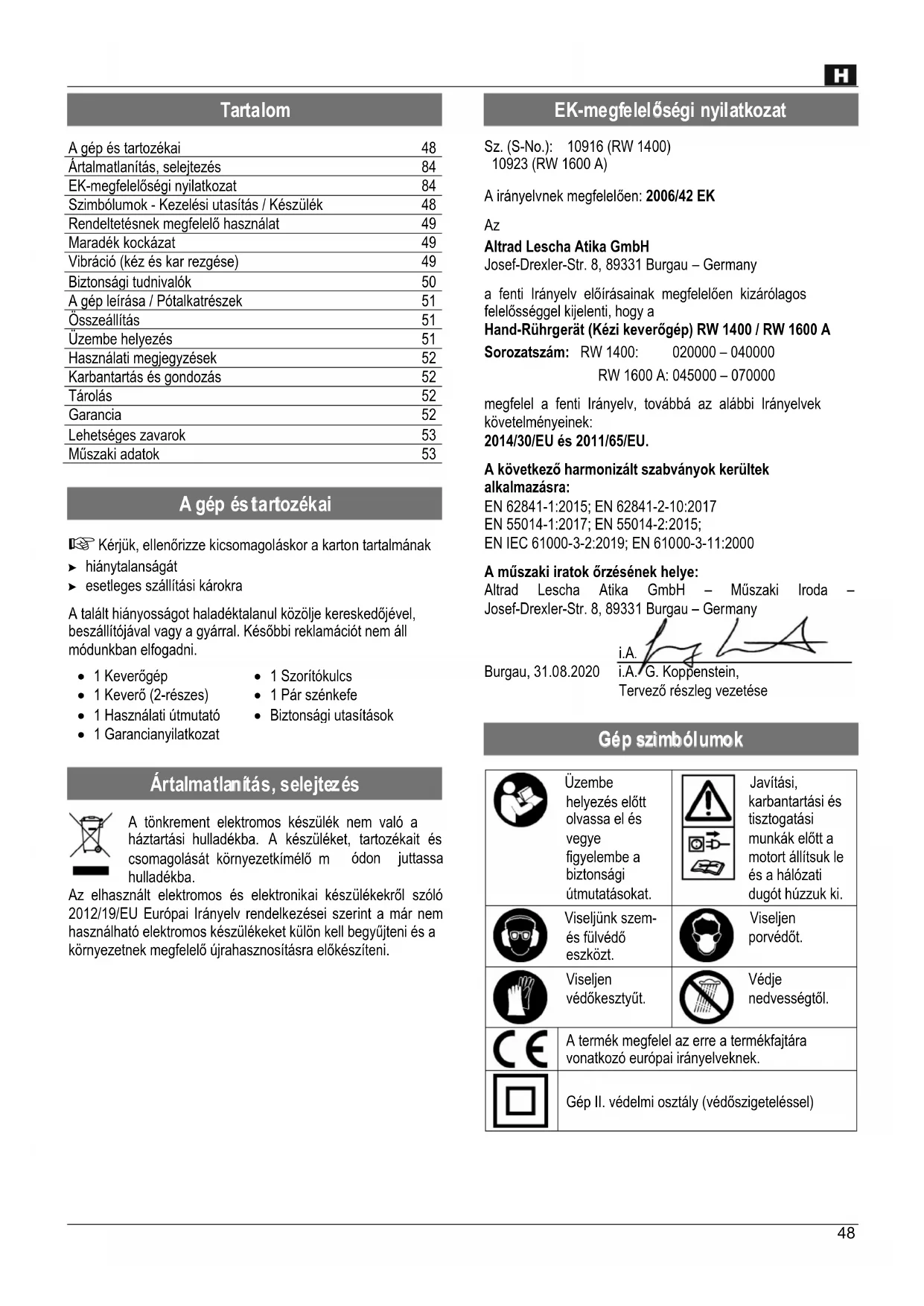 Altrad Lescha Atika GmbH Josef-Drexler-Str. 8, 89331 Burgau – Germany a fenti Irányelv előírásainak megfelelően kizárólagos felelősséggel kijelenti, hogy a Hand-Rührgerät (Kézi keverőgép) RW 1400 / RW 1600 A Sorozatszám: RW 1400: 020000 – 040000 RW 1600 A: 045000 – 070000 megfelel a fenti Irányelv, továbbá az alábbi Irányelvek követelményeinek: 2014/30/EU és 2011/65/EU. A következő harmonizált szabványok kerültek alkalmazásra: EN 62841-1:2015; EN 62841-2-10:2017 EN 55014-1:2017; EN 55014-2:2015; EN IEC 61000-3-2:2019; EN 61000-3-11:2000