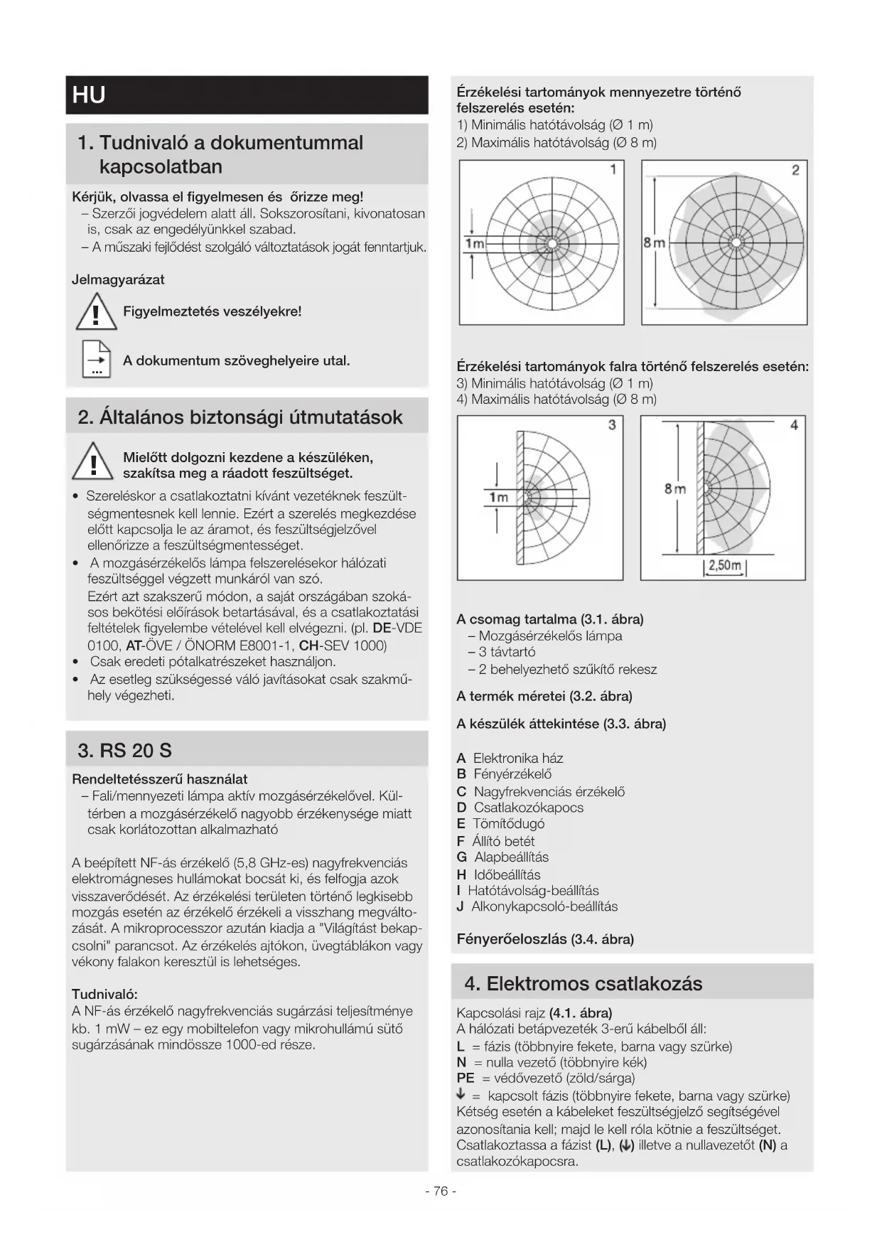 Rendeltetésszerű használat – Fali/mennyezeti lámpa aktív mozgásérzékelővel. Kül-térben a mozgásérzékelő nagyobb érzékenysége miatt csak korlátozottan alkalmazható A beépített NF-ás érzékelő (5,8GHz-es) nagyfrekvenciás elektromágneses hullámokat bocsát ki, és felfogja azok visszaverődését. Az érzékelési területen történő legkisebb mozgás esetén az érzékelő érzékeli a visszhang megválto-zását. A mikroprocesszor azután kiadja a "Világítást bekap-csolni" parancsot. Az érzékelés ajtókon, üvegtáblákon vagy vékony falakon keresztül is lehetséges.Tudnivaló:A NF-ás érzékelő nagyfrekvenciás sugárzási teljesítménye kb. 1mW – ez egy mobiltelefon vagy mikrohullámú sütő sugárzásának mindössze 1000-ed része. !- 77 - Fontos: A csatlakozások felcserélése később zárlathoz vezet a készülékben vagy a bizto sítékdobozban. Ebben az esetben ismét azonosítani kell az egyes kábeleket, és újból össze kell kötni őket. A hálózati betápvezetékbe a ki- és bekapcsolás céljából természetesen hálózati kapcsoló is szerelhető (vészvilágítás-modul használata nélkül). Fényerőszabályzóhoz való csatlakoztatás a mozgásérzé- kelős lámpa károsodását okozza. Tudnivaló: Ne érintse meg a LED-et közvetlenül. Tudnivaló: a lámpa fényforrását nem lehet cserélni. Ameny- nyiben a fényforrást cserélni kell (mert pl. az élettartamának végére ért), a teljes lámpát le kell cserélni.