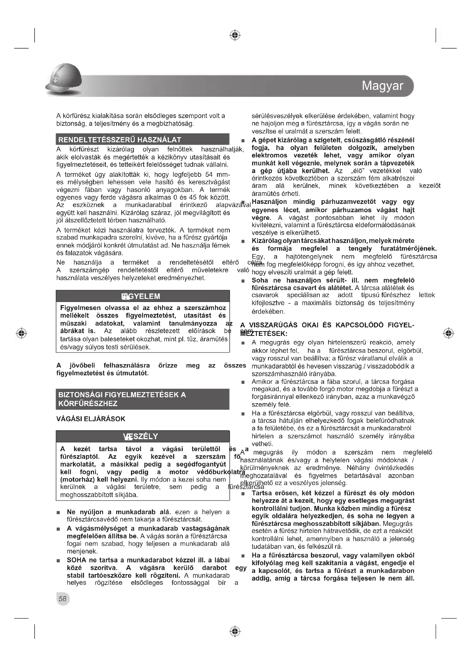 VESZÉLY $ NH]pW WDUWVD WiYRO D YiJiVL WHUOHWWĘO pV D IĦUpV]ODSWyO $] HJ\LN NH]pYHO D V]HUV]iP IĘ markolatát, a másikkal pedig a segédfogantyút NHOO IRJQL YDJ\ SHGLJ D PRWRU YpGĘEXUNRODWUD (motorház) kell helyezni. Ily módon a kezei soha nem NHUOQHN D YiJiVL WHUOHWUH VHP SHGLJ D IĦUpV]WiUFVD meghosszabbított síkjába. Ŷ Ne nyúljon a munkadarab alá. ezen a helyen a IĦUpV]WiUFVDYpGĘQHPWDNDUMDDIĦUpV]WiUFViW Ŷ A vágásmélységet a munkadarab vastagságának PHJIHOHOĘHQiOOtWVDEH$YiJiVVRUiQDIĦUpV]WiUFVD fogai nem szabad, hogy teljesen a munkadarab alá menjenek. Ŷ SOHA ne tartsa a munkadarabot kézzel ill. a lábai N|]p V]RUtWYD $ YiJiVUD NHUOĘ GDUDERW HJ\ stabil tartóeszközre kell rögzíteni. A munkadarab KHO\HV U|J]tWpVH HOVĘGOHJHV IRQWRVViJJDO EtU D sérülésveszélyek elkerülése érdekében, valamint hogy QHKDMROMRQPHJDIĦUpV]WiUFVDtJ\DYiJiVVRUiQQH veszítse el uralmát a szerszám felett. Ŷ A gépet kizárólag a szigetelt, csúszásgátló részénél fogja, ha olyan felületen dolgozik, amelyben elektromos vezeték lehet, vagy amikor olyan munkát kell végeznie, melynek során a tápvezeték a gép útjába kerülhet. $] ÄpOĘ´ YH]HWpNNHO YDOy érintkezés következtében a szerszám fém alkatrészei iUDP DOi NHUOQHN PLQHN N|YHWNH]WpEHQ D NH]HOĘW áramütés érheti. Ŷ +DV]QiOMRQ PLQGLJ SiUKX]DPYH]HWĘW YDJ\ HJ\ egyenes lécet, amikor párhuzamos vágást hajt végre. A vágást pontosabban lehet ily módon NLYLWHOH]QLYDODPLQWDIĦUpV]WiUFVDHOGHIRUPiOyGiViQDN YHV]pO\HLVHONHUOKHWĘ Ŷ Kizárólag olyan tárcsákat használjon, melyek mérete pV IRUPiMD PHJIHOHO D WHQJHO\ IXUDWiWPpUĘMpQHN (J\ D KDMWyWHQJHO\QHN QHP PHJIHOHOĘ IĦUpV]WiUFVD QHPIRJPHJIHOHOĘNpSSIRURJQLpVtJ\DKKR]YH]HWKHW hogy elveszíti uralmát a gép felett. Ŷ 6RKD QH KDV]QiOMRQ VpUOW LOO QHP PHJIHOHOĘ IĦUpV]WiUFVDFVDYDUWpVDOiWpWHWA tárcsa alátétek és FVDYDURN VSHFLiOLVDQD] DGRWW WtSXV~IĦUpV]KH] OHWWHN kifejlesztve - a maximális biztonság és teljesítmény érdekében. A VISSZARÚGÁS OKAI ÉS KAPCSOLÓDÓ FIGYEL- MEZTETÉSEK: Ŷ $ PHJXJUiV HJ\ RO\DQ KLUWHOHQV]HUĦ UHDNFLy DPHO\ DNNRUOpSKHWIHO KDD IĦUpV]WiUFVDEHV]RUXO HOJ|UEO YDJ\URVV]XOYDQEHiOOtWYDDIĦUpV]YiUDWODQXOHOYiOLND munkadarabtól és hevesen visszarúg / visszadobódik a szerszámhasználó irányába. Ŷ $PLNRUDIĦUpV]WiUFVDDIiEDV]RUXODWiUFVDIRUJiVD PHJDNDGpVDWRYiEEIRUJyPRWRUPHJGREMDDIĦUpV]WD IRUJiVLUiQQ\DOHOOHQNH]ĘLUiQ\EDQD]D]DPXQNDYpJ]Ę személy felé. Ŷ +DDIĦUpV]WiUFVDHOJ|UEOYDJ\URVV]XOYDQEHiOOtWYD DWiUFVD KiWXOMiQ HOKHO\H]NHGĘIRJDN EHOHI~UyGKDWQDN DIDIHOOHWpEHpVH]DIĦUpV]WiUFViWDPXQNDGDUDEUyO hirtelen a szerszámot használó személy irányába vetheti. $ PHJXJUiV LO\ PyGRQ D V]HUV]iP QHP PHJIHOHOĘ használatának és/vagy a helytelen vágási módoknak / körülményeknek az eredménye. Néhány óvintézkedés meghozatalával és figyelmes betartásával azonban HONHUOKHWĘH]DYHV]pO\HVMHOHQVpJ Ŷ 7DUWVD HUĘVHQ NpW Np]]HO D IĦUpV]W pV RO\ PyGRQ helyezze át a kezeit, hogy egy esetleges megugrást NRQWUROOiOQLWXGMRQ0XQNDN|]EHQPLQGLJDIĦUpV] egyik oldalára helyezkedjen, és soha ne legyen a IĦUpV]WiUFVDPHJKRVV]DEEtWRWWVtNMiEDQMegugrás HVHWpQDIĦUpV]KLUWHOHQKiWUDYHWĘGLNGHH]WDUHDNFLyW kontrollálni lehet, amennyiben a használó a jelenség tudatában van, és felkészül rá. Ŷ +DDIĦUpV]WiUFVDEHV]RUXOYDJ\YDODPLO\HQRNEyO kifolyólag meg kell szakítania a vágást, engedje el D NDSFVROyW pV WDUWVD D IĦUpV]W D PXQNDGDUDERQ addig, amíg a tárcsa forgása teljesen le nem áll.Magyar