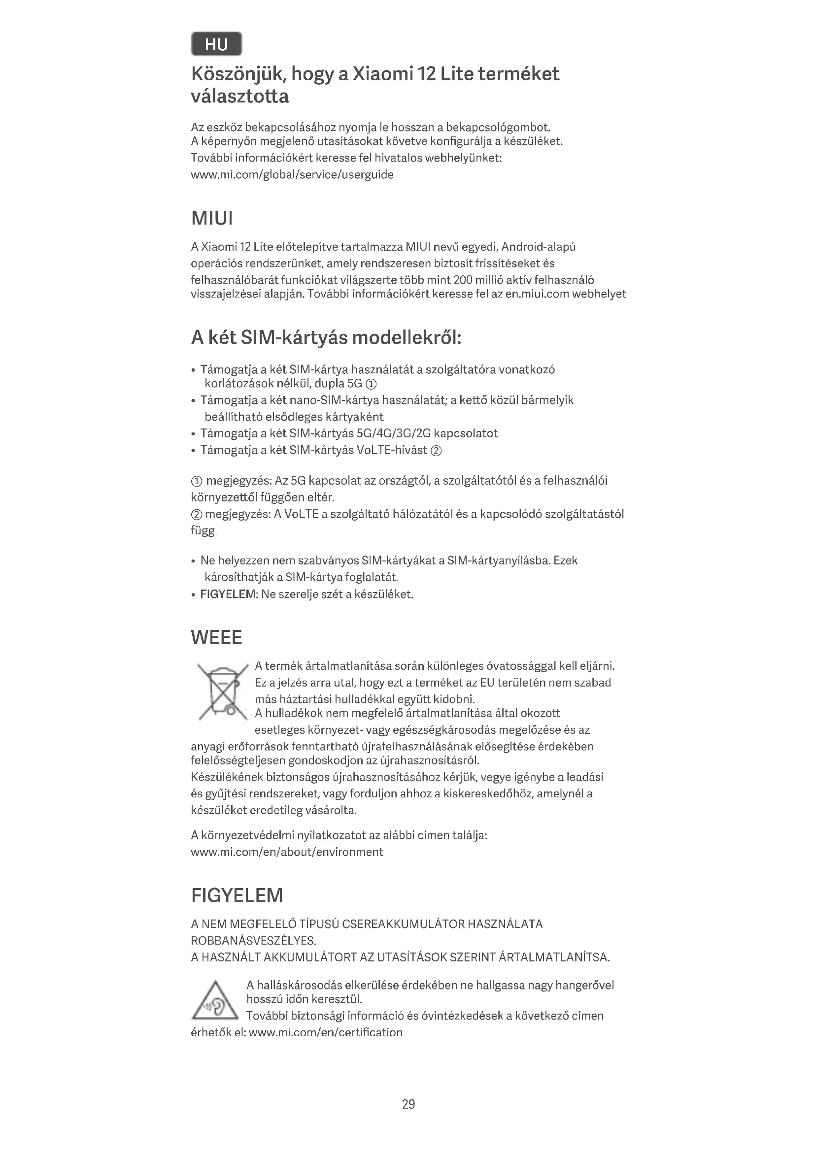 - FIGYELEM: Ne szerelje szét a készüléket. WEEE A termék ártalmatlanítása során különleges óvatossággal kell eljárni. Ez a jelzés arra utal, hogy ezt a terméket az EU területén nem szabad más háztartási hulladékkal együ kidobni. A hulladékok nem megfelelő ártalmatlanítása által okozo esetleges környezet- vagy egészségkárosodás megelőzése és az anyagi erőforrások fenntartható újrafelhasználásának elősegítése érdekében felelősségteljesen gondoskodjon az újrahasznosításról. Készülékének biztonságos újrahasznosításához kérjük, vegye igénybe a leadási és gyűjtési rendszereket, vagy forduljon ahhoz a kiskereskedőhöz, amelynél a készüléket eredetileg vásárolta. A környezetvédelmi nyilatkozatot az alábbi címen találja: www.mi.com/en/about/environment FIGYELEM A NEM MEGFELELŐ TÍPUSÚ CSEREAKKUMULÁTOR HASZNÁLATA ROBBANÁSVESZÉLYES. A HASZNÁLT AKKUMULÁTORT AZ UTASÍTÁSOK SZERINT ÁRTALMATLANÍTSA. A halláskárosodás elkerülése érdekében ne hallgassa nagy hangerővel hosszú időn keresztül. További biztonsági információ és óvintézkedések a következő címen érhetők el: www.mi.com/en/certification 29Fontos biztonsági információk A készülék használata elő olvassa el az alábbi biztonsági információkat: