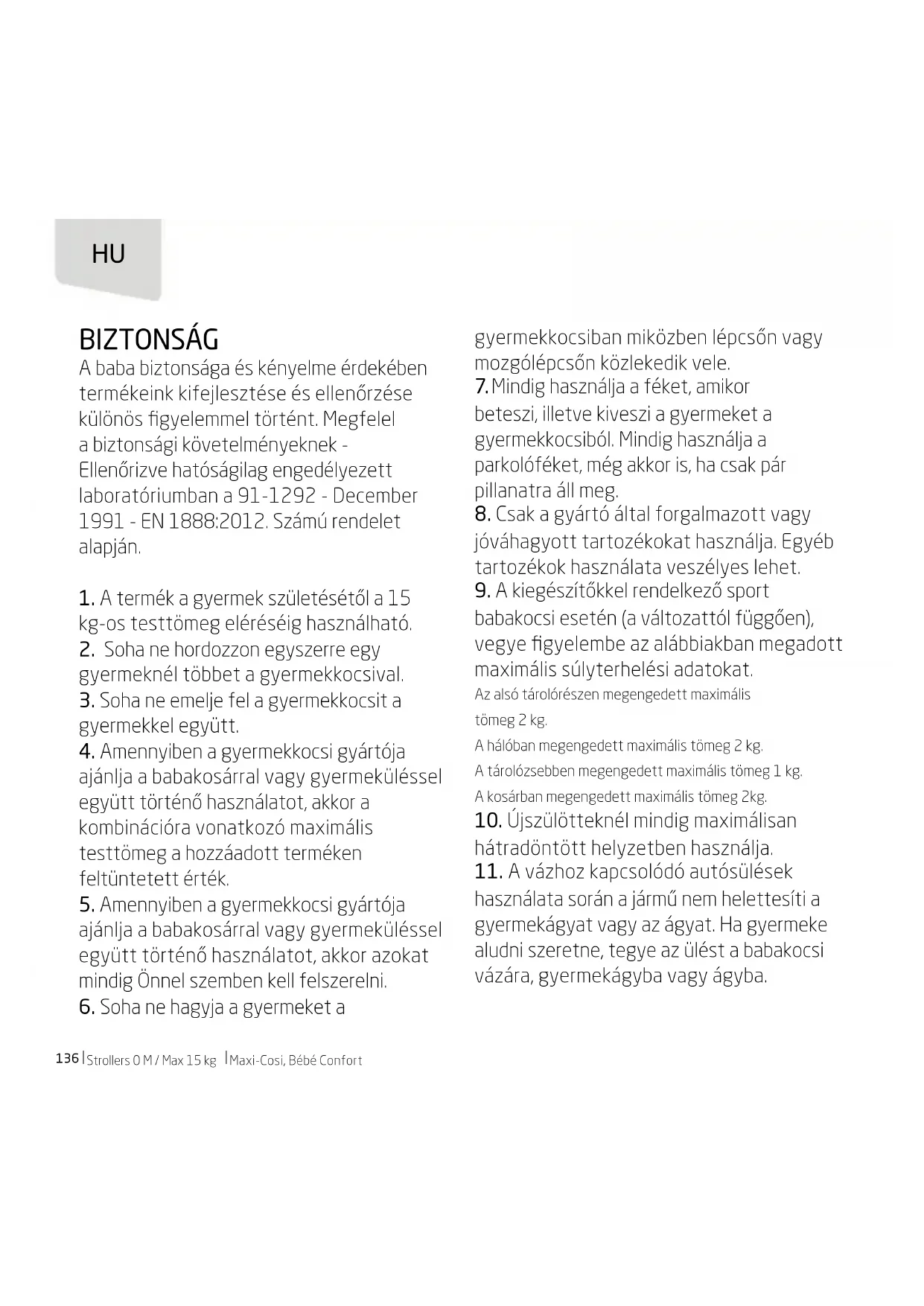 BIZTONSÁG A baba biztonsága és kényelme érdekében termékeink kifejlesztése és ellenőrzése különös figyelemmel történt. Megfelel a biztonsági követelményeknek - Ellenőrizve hatóságilag engedélyezett laboratóriumban a 91-1292 - December 1991 - EN 1888:2012. Számú rendelet alapján.