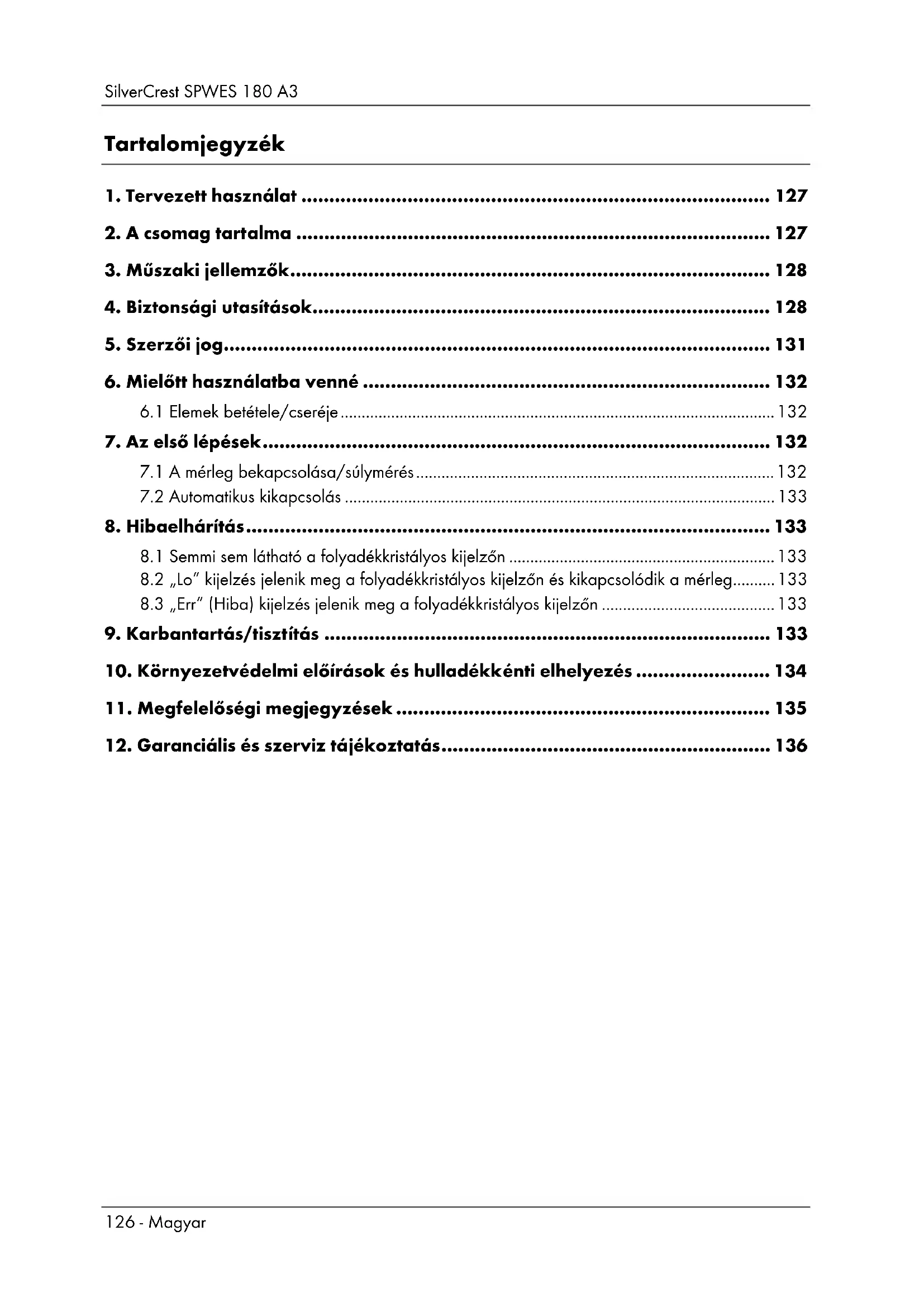 12. Garanciális és szerviz tájékoztatás ........................................................... 136SilverCrest SPWES 180 A3 Magyar - 127 Gratulálunk! A SilverCrest SPWES 180 A3 fürdőszobai mérleg továbbiakban fürdőszobai mérleg, megvásárlásával egy minőségi termékhez jutott hozzá. Az első használat előtt ismerkedjen meg a fürdőszobai mérleg működésével, és alaposan olvassa el a Használati útmutatót. Ügyeljen a biztonsági előírások betartására, és kizárólag a használati utasításban leírt módon és célokra használja a fürdőszobai mérleget. Tartsa a Kezelési útmutatót biztos helyen. Ha továbbadja a fürdőszobai mérleget, mellékelje a kapcsolódó dokumentumokat is.