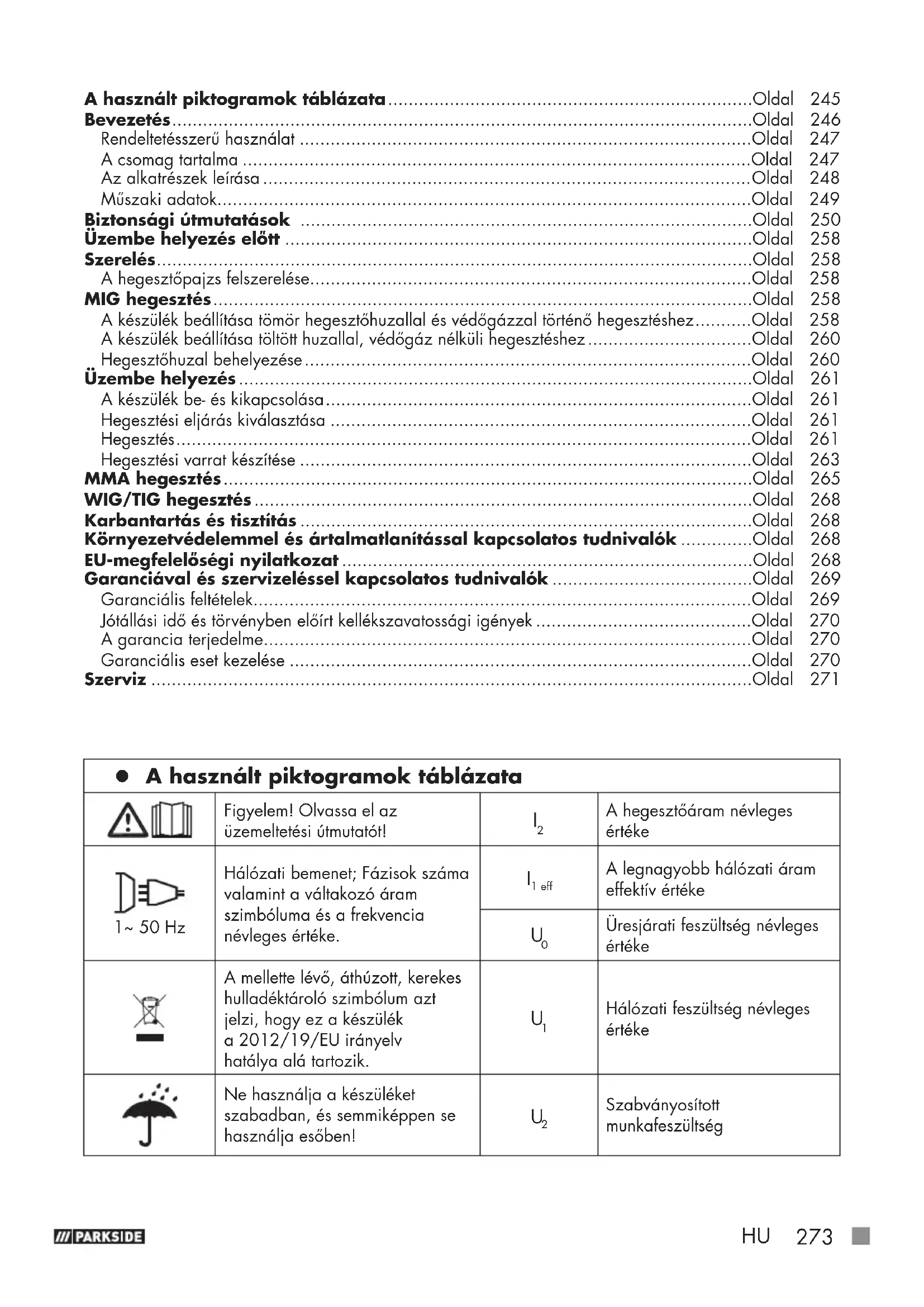 Szabványosított munkafeszültség A használt piktogramok táblázata .......................................................................Oldal 245 Bevezetés .................................................................................................................Oldal 246 Rendeltetésszerű használat ........................................................................................Oldal 247 A csomag tartalma ...................................................................................................Oldal 247 Az alkatrészek leírása ...............................................................................................Oldal 248 Műszaki adatok........................................................................................................Oldal 249 Biztonsági útmutatások ........................................................................................Oldal 250 Üzembe helyezés előtt ...........................................................................................Oldal 258 Szerelés ....................................................................................................................Oldal 258 A hegesztőpajzs felszerelése ......................................................................................Oldal 258 MIG hegesztés .........................................................................................................Oldal 258 A készülék beállítása tömör hegesztőhuzallal és védőgázzal történő hegesztéshez ...........Oldal 258 A készülék beállítása töltött huzallal, védőgáz nélküli hegesztéshez ................................Oldal 260 Hegesztőhuzal behelyezése .......................................................................................Oldal 260 Üzembe helyezés ....................................................................................................Oldal 261 A készülék be- és kikapcsolása ...................................................................................Oldal 261 Hegesztési eljárás kiválasztása ..................................................................................Oldal 261 Hegesztés ................................................................................................................Oldal 261 Hegesztési varrat készítése ........................................................................................Oldal 263 MMA hegesztés .......................................................................................................Oldal 265 WIG/TIG hegesztés .................................................................................................Oldal 268 Karbantartás és tisztítás ........................................................................................Oldal 268 Környezetvédelemmel és ártalmatlanítással kapcsolatos tudnivalók ..............Oldal 268 EU-megfelelőségi nyilatkozat ................................................................................Oldal 268 Garanciával és szervizeléssel kapcsolatos tudnivalók .......................................Oldal 269 Garanciális feltételek .................................................................................................Oldal 269 Jótállási idő és törvényben előírt kellékszavatossági igények ..........................................Oldal 270 A garancia terjedelme ...............................................................................................Oldal 270 Garanciális eset kezelése ..........................................................................................Oldal 270 Szerviz .....................................................................................................................Oldal 271274