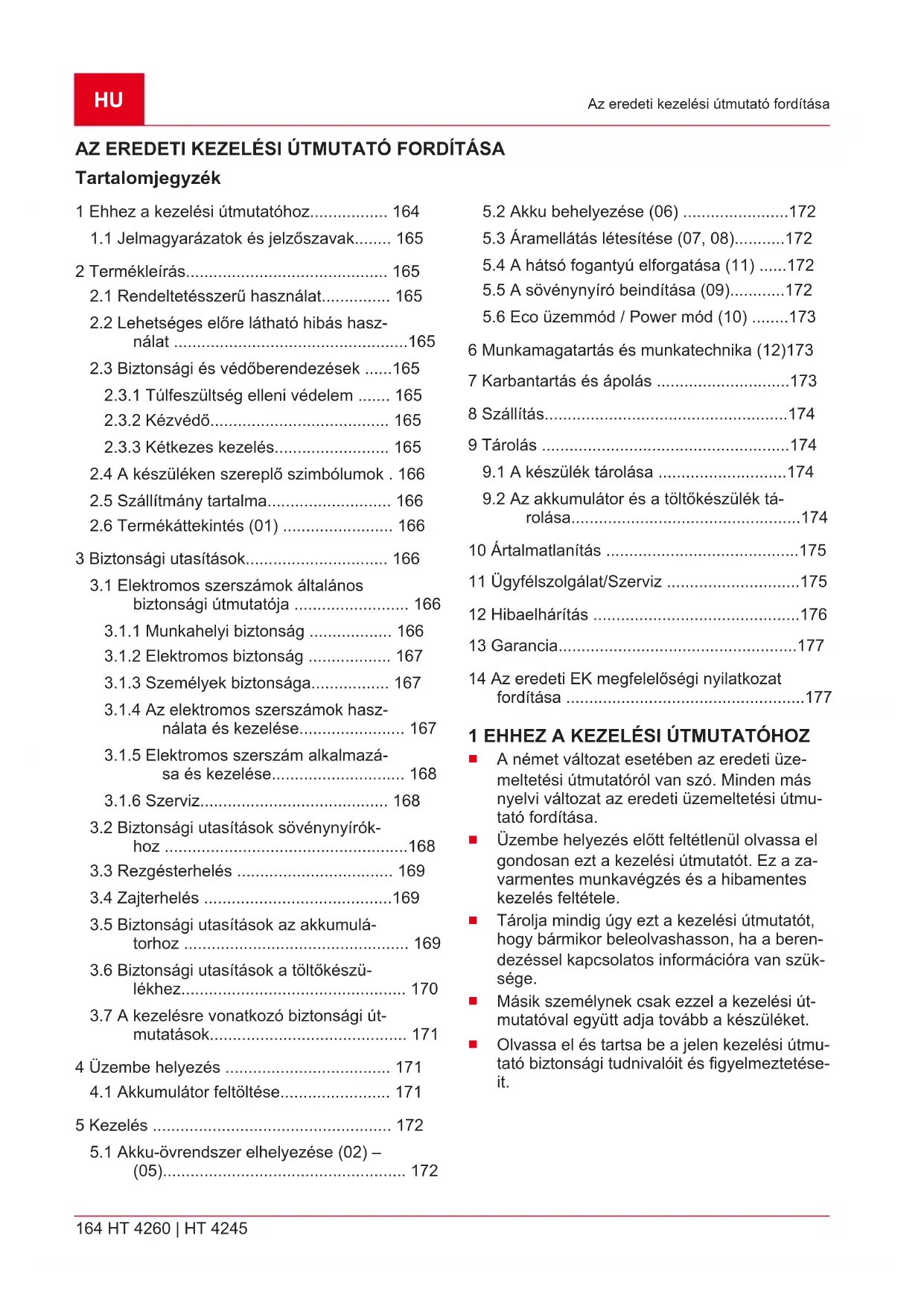 Sz. Alkatrész 1 Akkumulátoros sövényvágó HT 4260 2 Védőburkolat a vágókéshez 3 Üzemeltetési útmutató