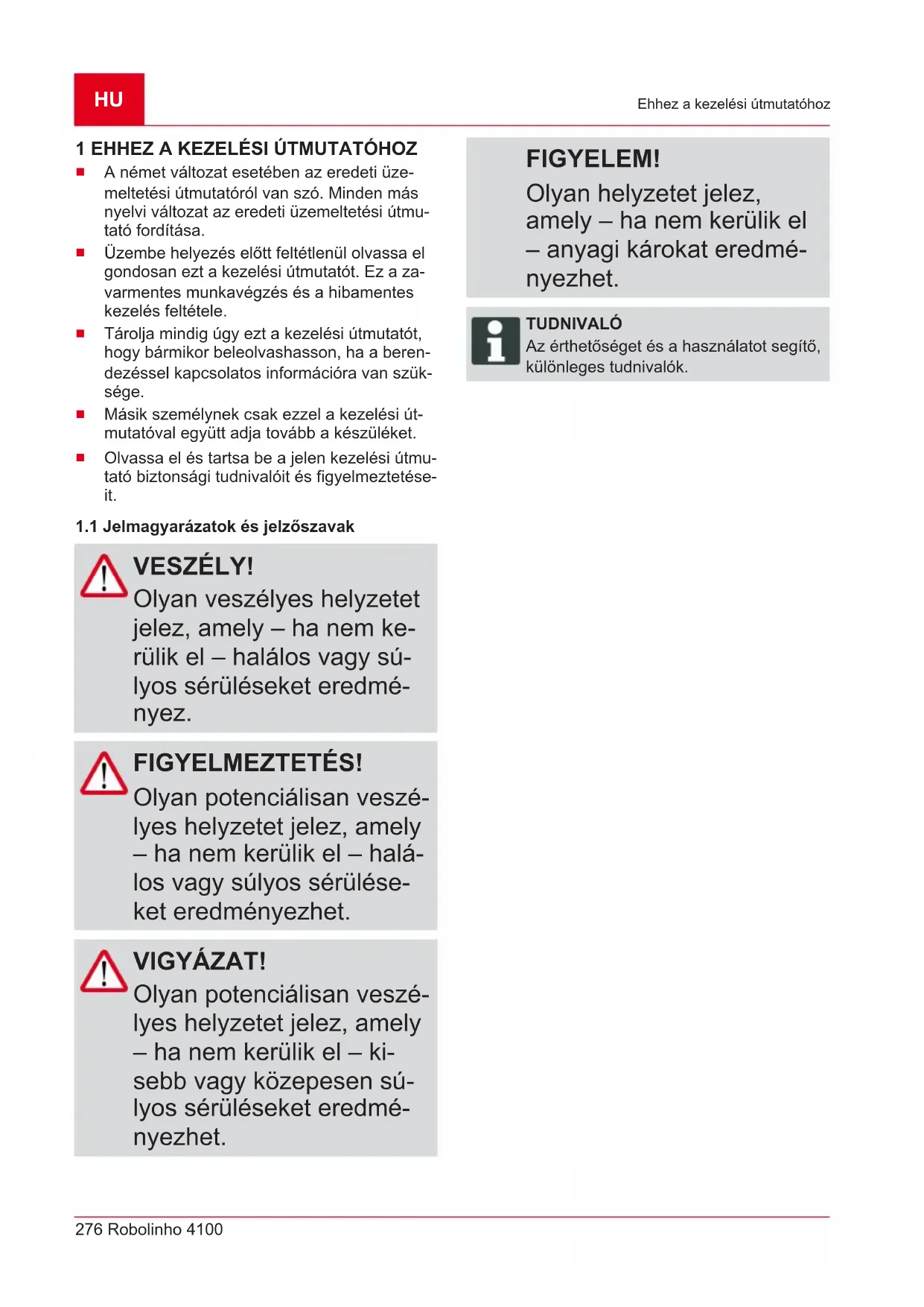 - 274 Robolinho 4100 Az eredeti kezelési útmutató fordítása 5 Üzembe helyezés p. 290
