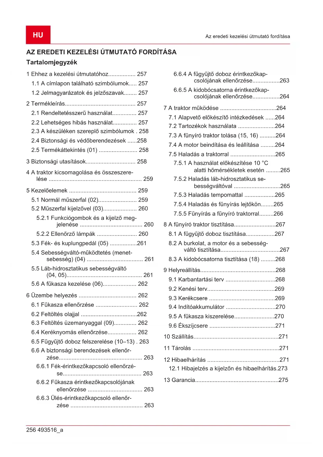 3 Biztonsági utasítások............................... 258 4 A traktor kicsomagolása és összeszere- lése .......................................................... 259 5 Kezelőelemek .......................................... 259