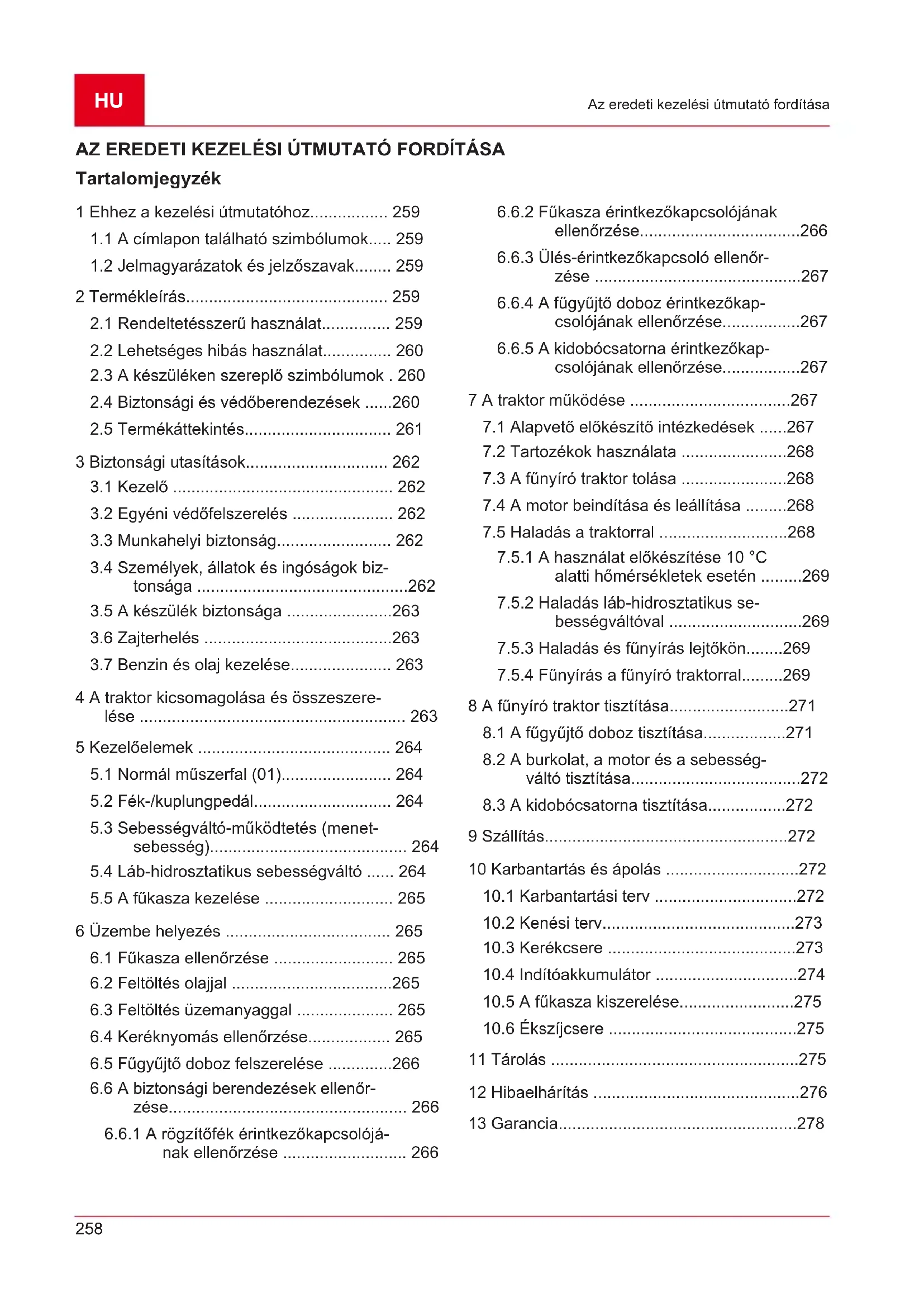 Az eredeti kezelési útmutató fordítása AZ EREDETI KEZELÉSI ÚTMUTATÓ FORDÍTÁSA Tartalomjegyzék 1 Ehhez a kezelési útmutatóhoz................. 259