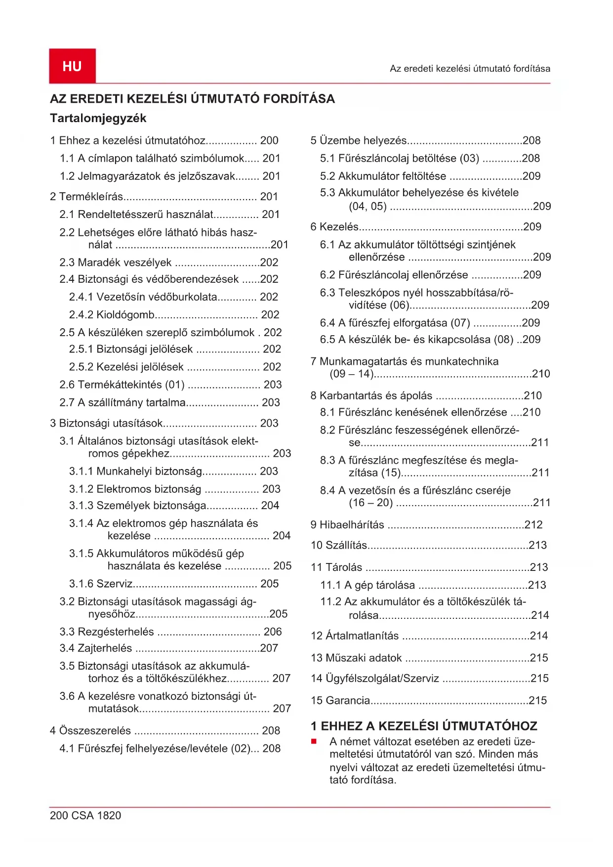 a kopó alkatrészekre, amelyek a pótalkatrész-katalógusban be vannak keretezve xxxxxx (x) A garancia az első végfelhasználó vásárlásától lép életbe. Az időpont meghatározásakor a fizetési bi- zonylaton szereplő dátum a mérvadó. A garanciajeggyel és az eredeti fizetési bizonylattal forduljon a szakkereskedéshez vagy a legközelebbi hivatalos ügyfélszolgálathoz. A vevő eladóval szembeni kel- lékszavatossági jogainak törvényes érvényesítési lehetőségeit a jelen nyilatkozat nem befolyásolja.DK 216 CSA 1820 Oversættelse af den originale brugsanvisning