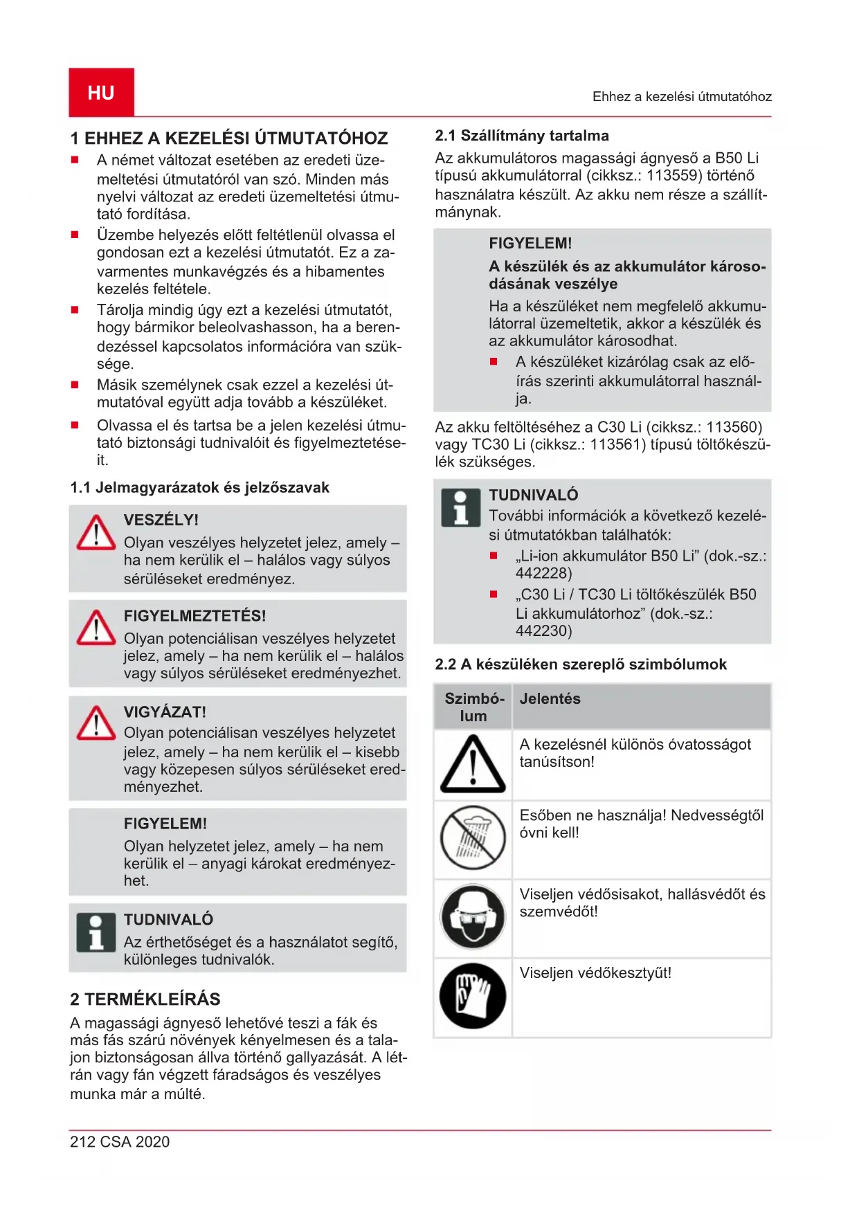 Sz. Alkatrész 1 Vezetősín védőtokja 2 Teleszkópos rúd 3 Az olajtartály beöntőnyílása 4 Fűrészlánc 5 Vezetősín 6 Rögzítőcsavar 7 Lánckerékburkolat 8 Fatámasztó bordázat 9 Az olajtartály figyelőablakaHU 214 CSA 2020 Biztonság Sz. Alkatrész 10 Szorítócsavar 11 Láncfeszítő csavar 12 Akkumulátor 13 Be-/kikapcsoló 14 Kioldógomb 15 Fogó 16 A hordheveder füle 17 Tartóhám 3 BIZTONSÁG
