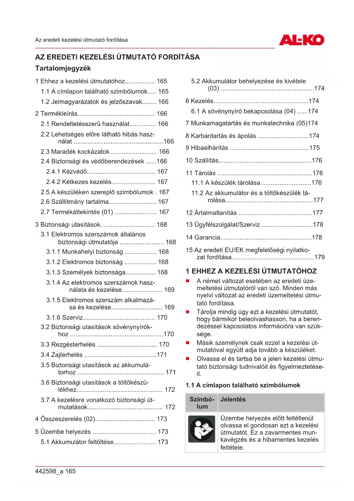 Szimbó- lum Jelentés A kezelésnél különös óvatosságot tanúsítson! Üzembe helyezés előtt olvassa el a kezelési útmutatót! A készüléket óvja az esőtől és a nedvességtől! Viseljen hallásvédőt! Viseljen szemvédőt! Viseljen légzésvédőt! Az akkumulátort távolítsa el, mielőtt a készüléken beállítást vagy tisztítá- si munkát végez, vagy ha a készü- léket hosszabb ideig felügyelet nél- kül hagyja.