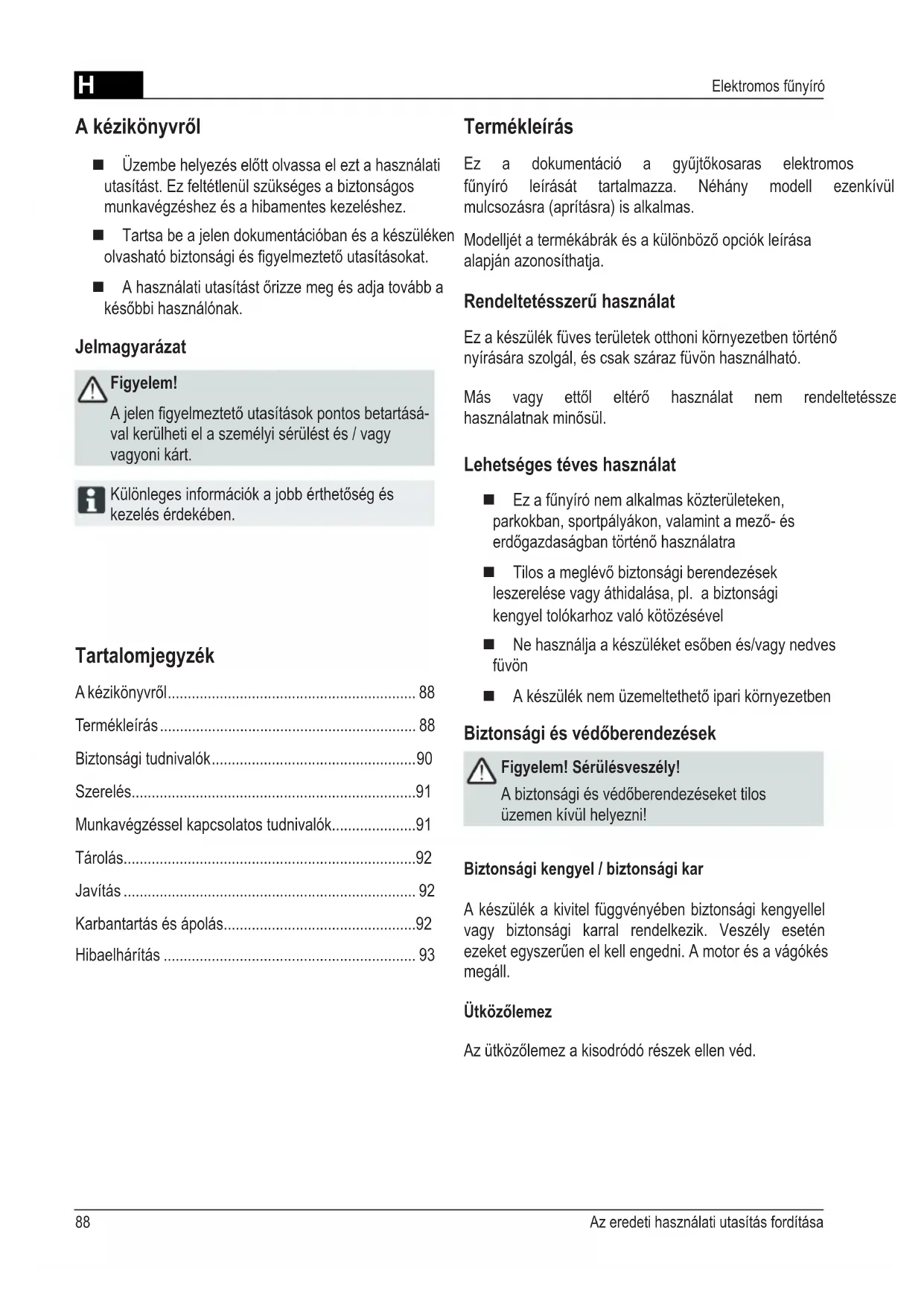- Elektromos fűnyíró Tartalomjegyzék Akézikönyvről p. 88