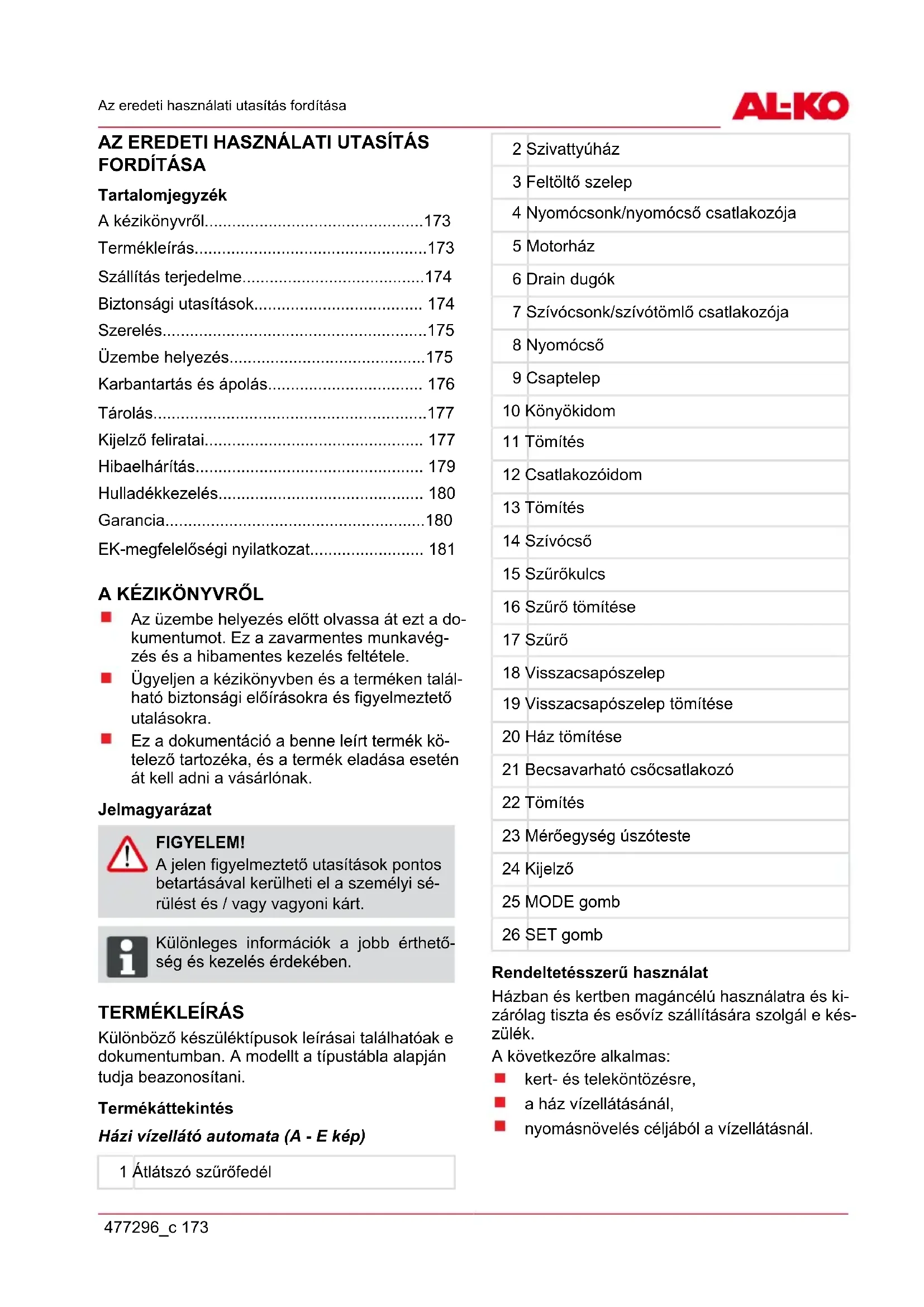 Különböző készüléktípusok leírásai találhatóak e dokumentumban. A modellt a típustábla alapján tudja beazonosítani. Termékáttekintés Házi vízellátó automata (A - E kép) 1 Átlátszó szűrőfedél 2 Szivattyúház 3 Feltöltő szelep 4 Nyomócsonk/nyomócső csatlakozója 5 Motorház 6 Drain dugók 7 Szívócsonk/szívótömlő csatlakozója 8 Nyomócső 9 Csaptelep 10 Könyökidom 11 Tömítés 12 Csatlakozóidom 13 Tömítés 14 Szívócső 15 Szűrőkulcs 16 Szűrő tömítése 17 Szűrő 18 Visszacsapószelep 19 Visszacsapószelep tömítése 20 Ház tömítése 21 Becsavarható csőcsatlakozó 22 Tömítés 23 Mérőegység úszóteste 24 Kijelző 25 MODE gomb 26 SET gomb Rendeltetésszerű használat Házban és kertben magáncélú használatra és ki- zárólag tiszta és esővíz szállítására szolgál e kés- zülék. A következőre alkalmas: kert- és teleköntözésre, a ház vízellátásánál, nyomásnövelés céljából a vízellátásnál.hu Termékleírás