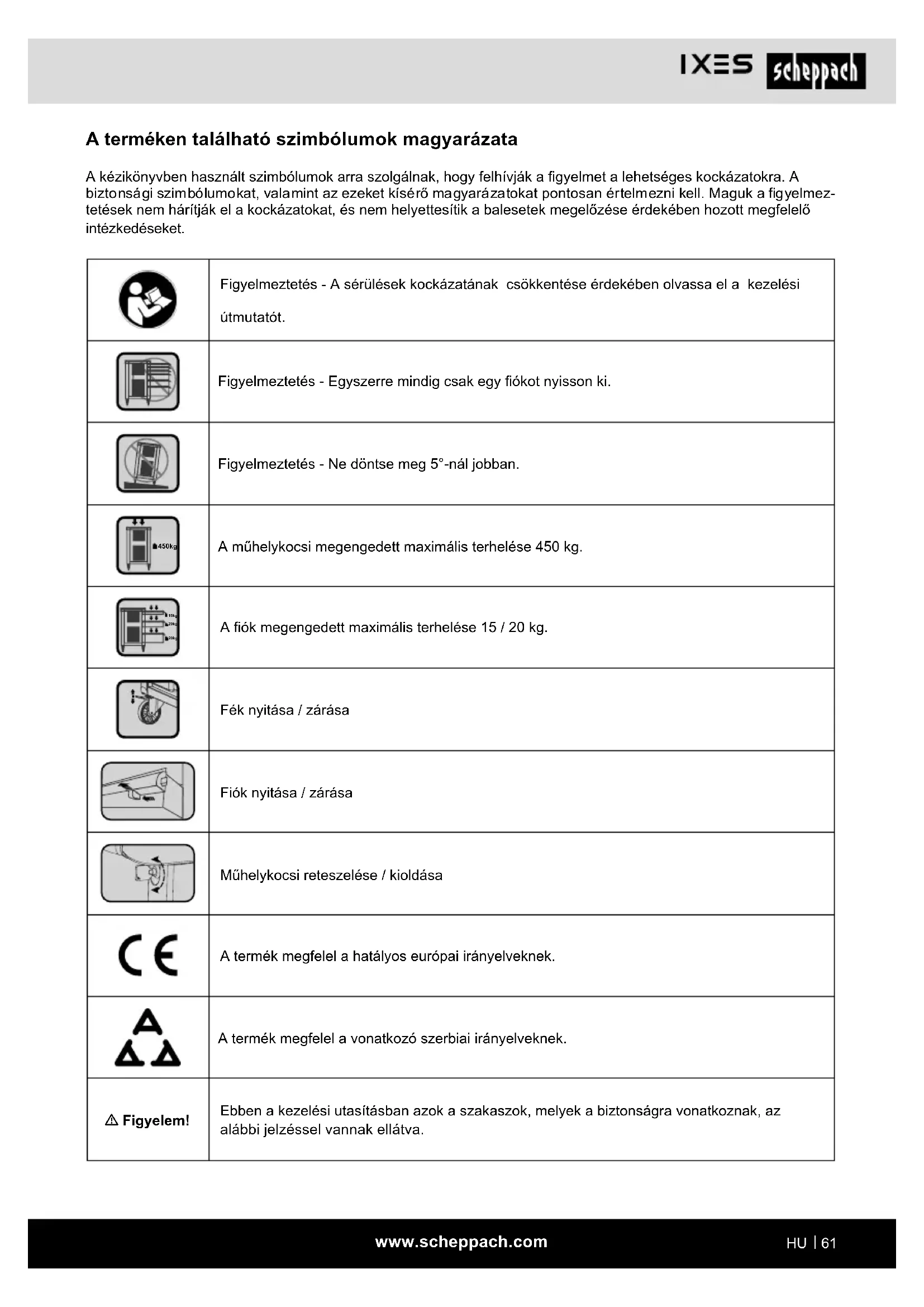 A terméken található szimbólumok magyarázata A kézikönyvben használt szimbólumok arra szolgálnak, hogy felhívják a gyelmet a lehetséges kockázatokra. A biztonsági szimbólumokat, valamint az ezeket kísérő magyarázatokat pontosan értelmezni kell. Maguk a gyelmez- tetések nem hárítják el a kockázatokat, és nem helyettesítik a balesetek megelőzése érdekében hozott megfelelő intézkedéseket. Figyelmeztetés - A sérülések kockázatának csökkentése érdekében olvassa el a kezelési útmutatót. Figyelmeztetés - Egyszerre mindig csak egy ókot nyisson ki. Figyelmeztetés - Ne döntse meg 5°-nál jobban. 450kg A műhelykocsi megengedett maximális terhelése 450 kg. 15kg 20kg 20kg A ók megengedett maximális terhelése 15 / 20 kg. Fék nyitása / zárása Fiók nyitása / zárása Műhelykocsi reteszelése / kioldása A termék megfelel a hatályos európai irányelveknek. A termék megfelel a vonatkozó szerbiai irányelveknek. m Figyelem! Ebben a kezelési utasításban azok a szakaszok, melyek a biztonságra vonatkoznak, az alábbi jelzéssel vannak ellátva.www.scheppach.com